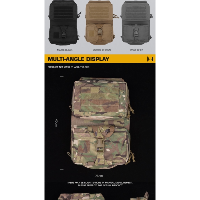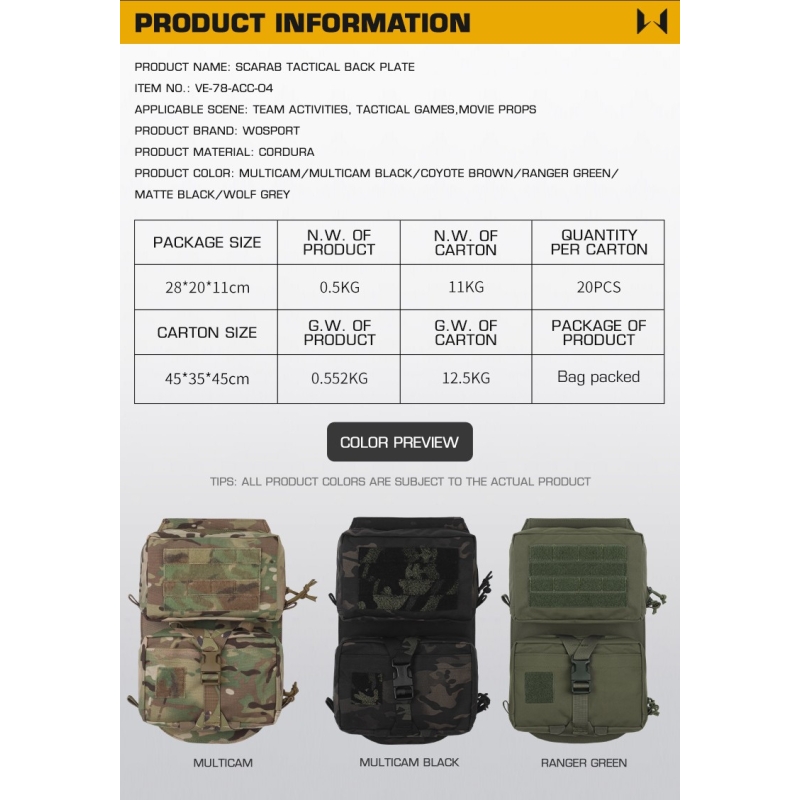The Scarab Back MOLLE Platform by WoSporT is a multifunctional back panel that easily attaches to a plate carrier or vest using MOLLE webbing. The panel includes two large pouches.