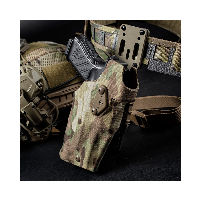 Set of holster, Low Rise platform, Quick Release buckles, and an elastic thigh strap.