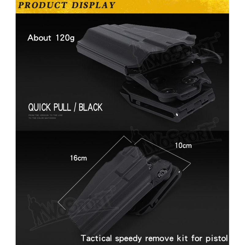 WoSporT Quick Locking System Kit for QLS holsters in black is a quick-release mounting set inspired by the well-known QLS system. It allows instant detachment of the pistol holster from the carrying platform without removing any screws. A solid polymer triple-lock claw ensures a secure connection. Ideal solution for swapping holsters between different...