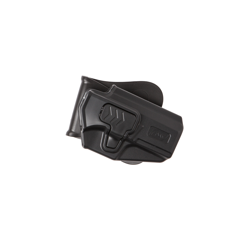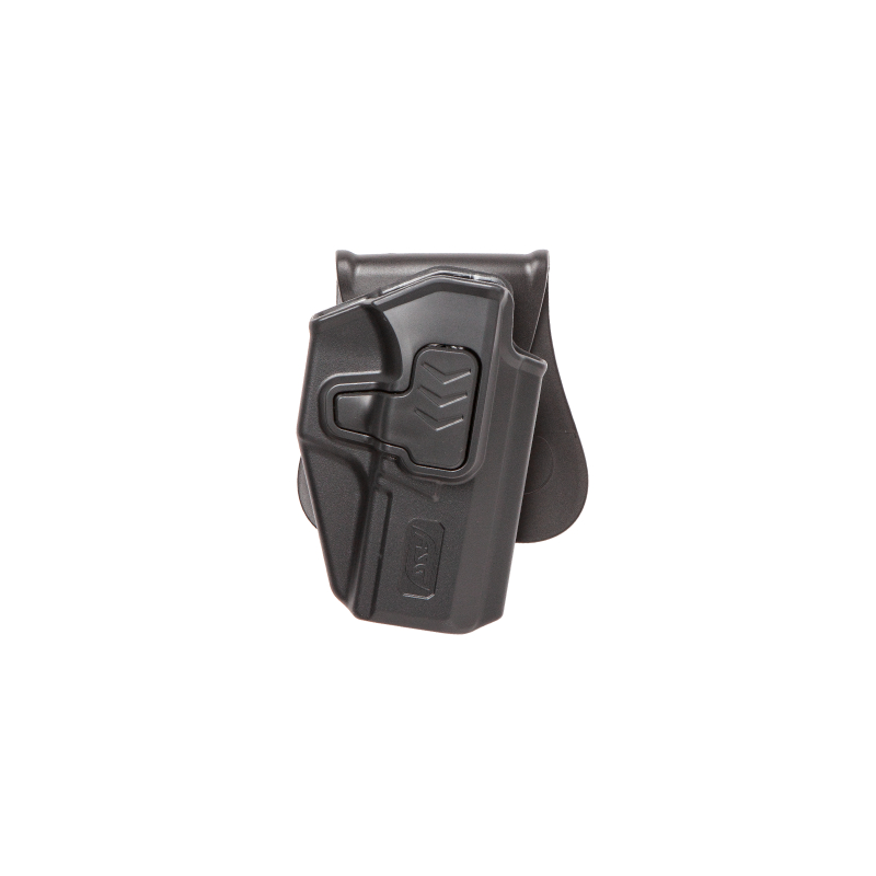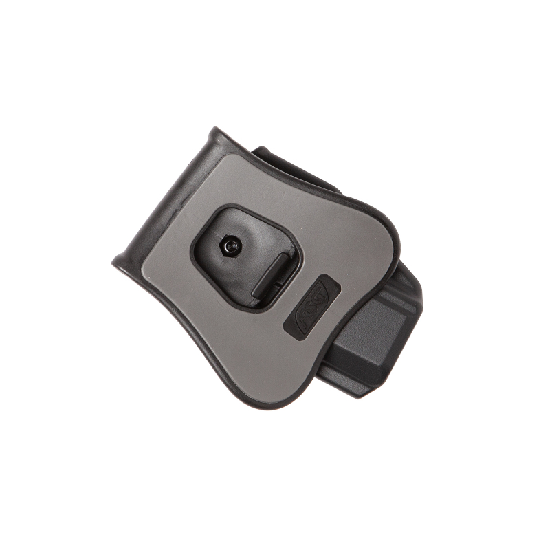 This tactical belt holster is designed for CZ P-10C pistols, offering both fast draw and secure weapon retention. Thanks to its 360° rotating mechanism, the holster can be adjusted for side, back, or cross-draw carry, providing maximum flexibility. It is made from high-tech polymer, making it lightweight, sturdy, and durable. The holster features a paddle-type mount, allowing attachment to belts up to 42 mm wide or directly onto the waistband. The rubberized back of the paddle ensures comfort during wear and prevents unwanted movement of the holster. The holster mount is also compatible with other manufacturers using a 360° single-screw mounting system (e.g., Amomax).