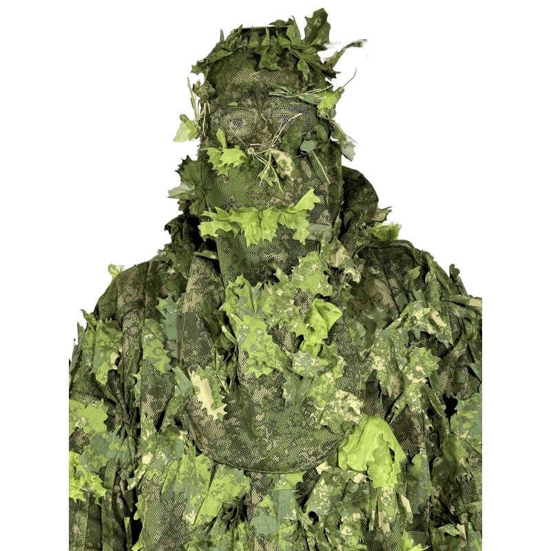 KMCS Balaclava is designed for snipers who want to fully conceal their face while maintaining a natural look in the field. Thanks to randomly distributed 3D leaves and an extended section reaching the chest, it breaks up the silhouette of the head and neck and significantly reduces shadows that often reveal your position. The top of the balaclava is covered with leaves, mimicking branches or tree stumps and blending naturally into the environment. The construction includes elastic loops for adding vegetation or artificial elements such as Novritsch Leaf Camo System, ANAREUS SilkLeaf or SilkGrass, allowing easy customization for specific environments. Dual-side adjustment straps ensure a comfortable and secure fit. For maximum effectiveness, we recommend enhancing eye area camouflage with face paint or modified goggles. If you want to learn more about camouflage, read our article Sniper - how to camouflage and ghillie suit.