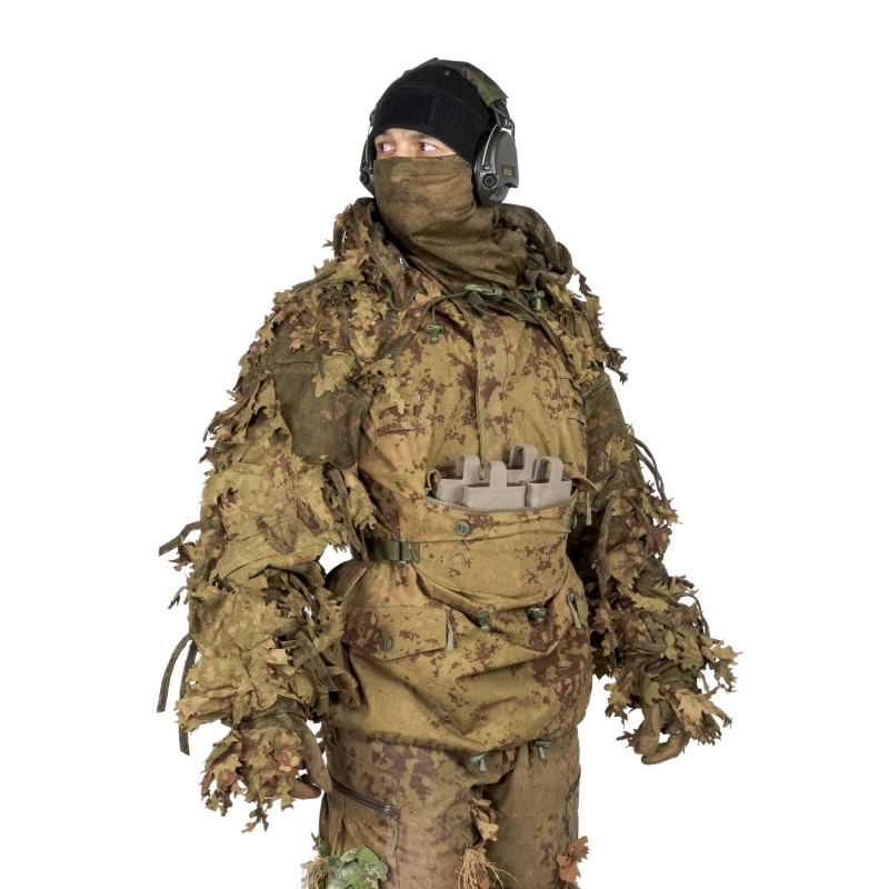 KMCS Cobra Hood is based on the Viper Hood concept, but adds extended shoulder and arm coverage, allowing full access to your gear on a plate carrier or chest rig while effectively breaking up your silhouette. The surface is covered with realistic 3D leaves that mimic forest structure and eliminate sharp contours. Thanks to attachment loops, you can add natural vegetation or artificial elements such as Novritsch Leaf Camo System, ANAREUS SilkLeaf or SilkGrass, adapting your camouflage to current conditions. The oversized hood holds its shape and allows use with a helmet or provides additional coverage for optics while aiming. The material is a polyester and cotton blend with KMCS “magic dust”, helping you blend into the environment and reduce the risk of detection. If you want to learn more about camouflage, check out our article Sniper - how to camouflage and ghillie suit.
