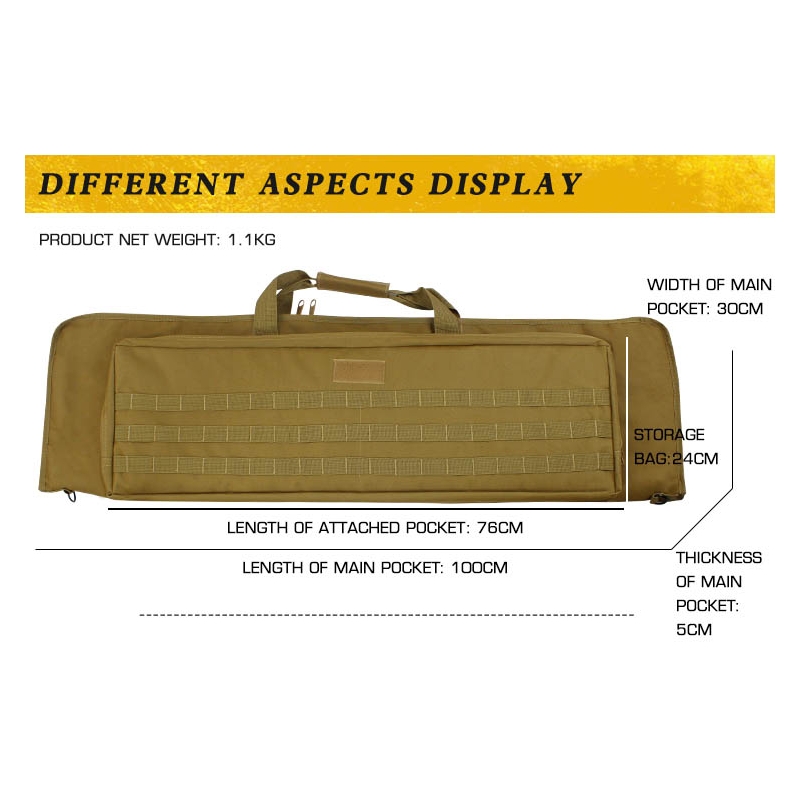 The bag is made from durable Oxford 900D fabric, which provides good resistance to abrasion and moisture. The main compartment measuring 100 × 30 × 5 cm fits M4-type rifles, HK416, MK18 and other similar platforms. The second, smaller pocket measuring 76 × 24 × 6 cm includes loops and compartments for magazines or accessories. Inside the main compartment the rifle can be secured using hook-and-loop straps with MAGIC FASTENER. Handling is made easier by a padded carry handle and a shoulder strap with a soft pad. External MOLLE panels allow you to attach additional pouches and equipment as needed. The bag meets legal requirements stating that a firearm must not be visibly carried in public.