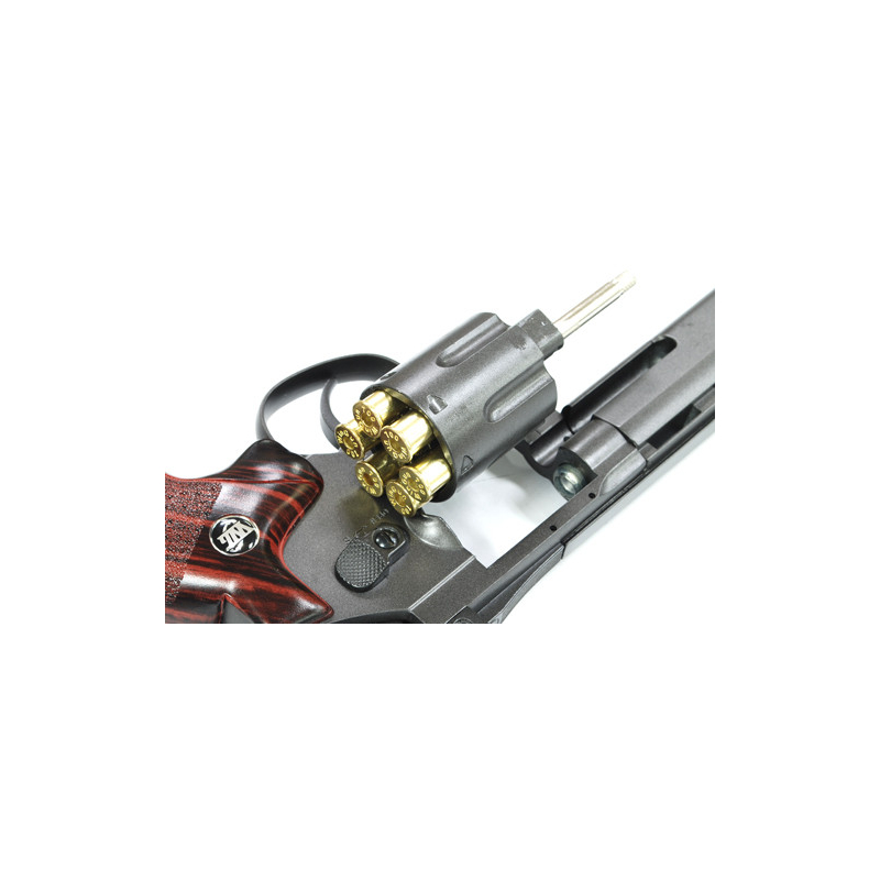 Each shot is loaded individually using realistic shells that fit into the cylinder. The package includes a speed loader for quick reloading and a tactical RIS rail for mounting optics. This revolver does not have a hop-up system.