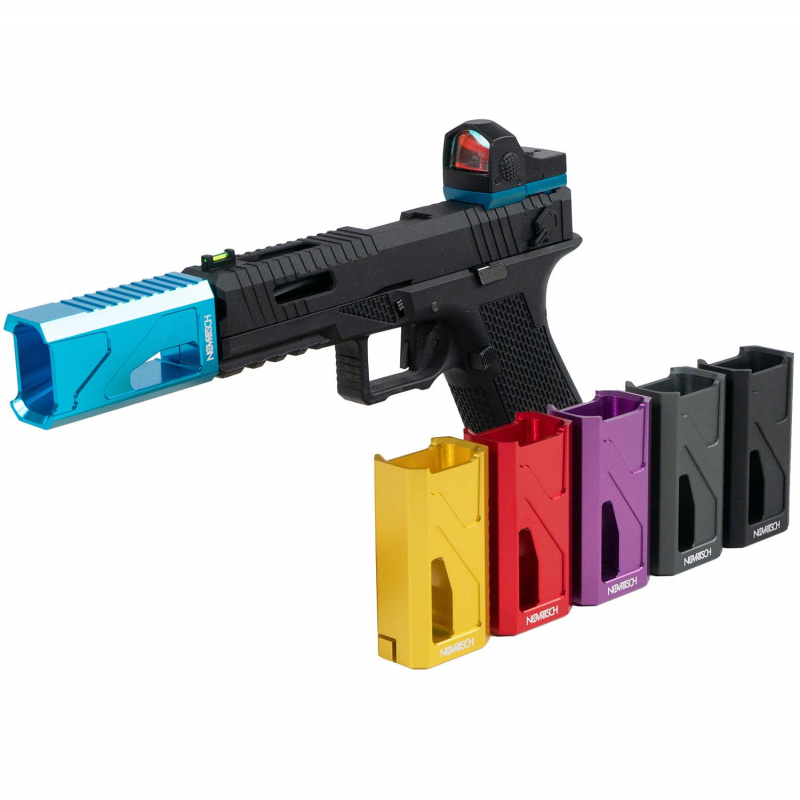 CNC Aluminum Compensator for the SSP18 GBB Airsoft Pistol by Novritsch in black. Conceals a longer 130mm barrel for increased muzzle velocity. Precisely CNC machined from aircraft-grade aluminum. Compatible with open-bottom holsters. 14mm CCW thread allows use on other pistols (centering may vary).