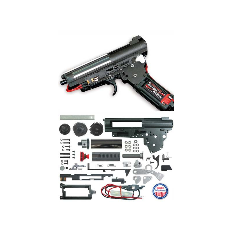 Complete Gearbox by CYMA for AEP CM030 (G-Series 18C). Fully assembled metal gearbox, including the motor. Original replacement part for AEP CM.030. Includes full wiring, ready for installation. Designed for standard version without MOSFET. Installation requires expertise in AEP pistols and soldering.