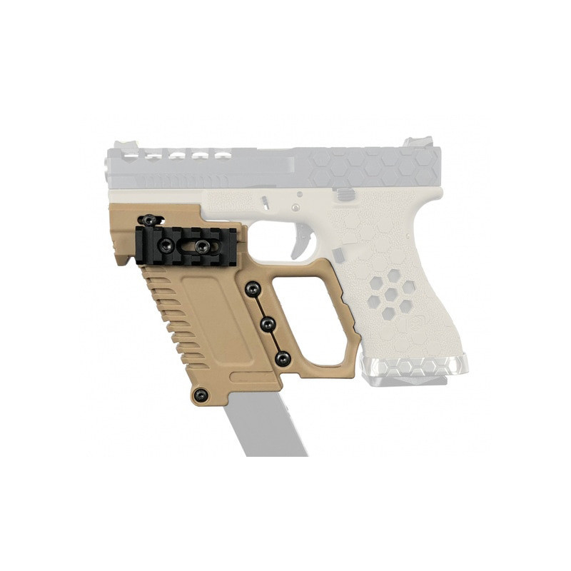 View larger WoSporT ergonomic GB-37 RIS kit for G-series airsoft pistols in tan finish provides a more stable grip. Side RIS rails allow mounting of a tactical flashlight or laser. The spare magazine holder speeds up reloading. The kit installs onto the lower rail of G-series GBB / AEP pistols (17, 18C, 19). Not compatible with real Glock firearms (G17, G19, etc.).