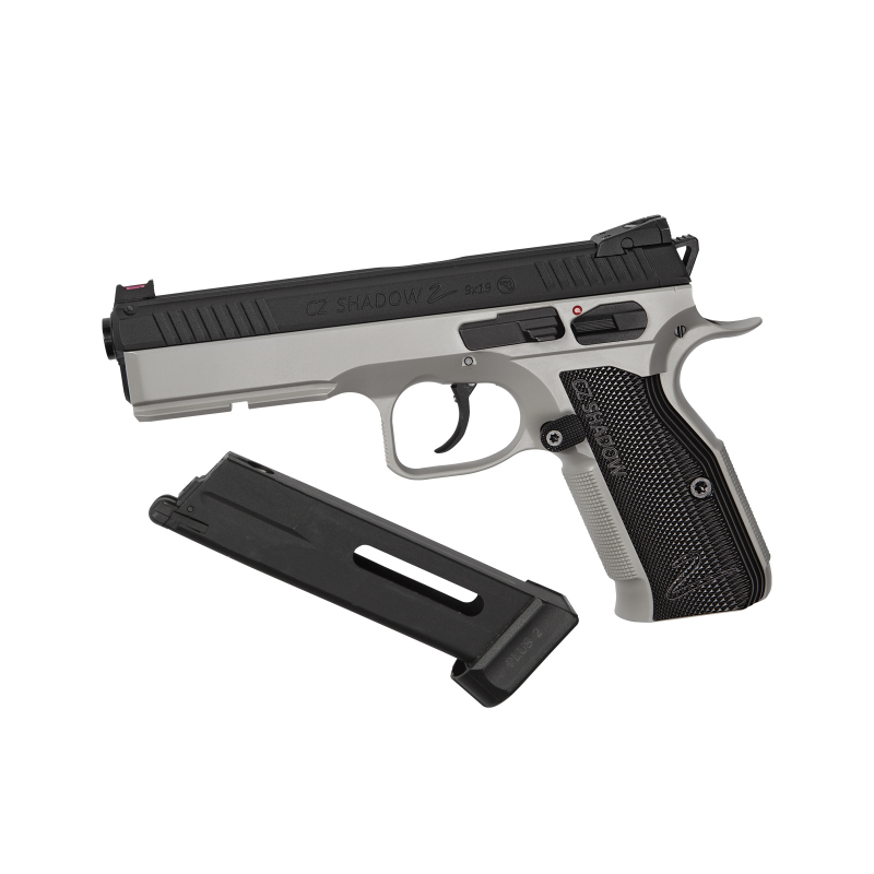 CO2 gas pistol CZ-75 Shadow 2 by ASG with a black slide and Urban Grey frame with black grips.
