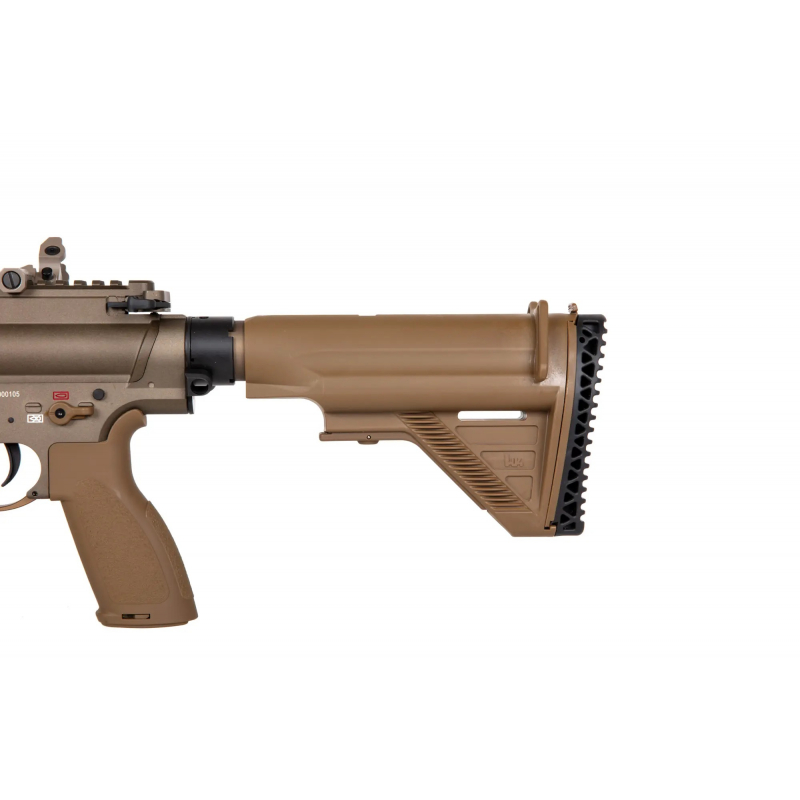 This weapon relies on carefully selected materials and first-class manufacturing processes, combining the efforts of German Umarex with VFC, reflected in every detail both externally and internally. As a proper DMR rifle, this version features a 455mm precision barrel with a 6.03mm diameter and adjustable Hop-up, ensuring precise guidance of 6mm BBs to their target. Inside, you'll find the proven VFC V2-QSC gearbox, offering excellent potential for future upgrades, although it already provides the rifle with a perfect performance of 130 m/s, with metal reinforcement parts such as CNC gears, cylinder head, and piston with 14 metal teeth, all protected by high-quality wiring with Mosfet.