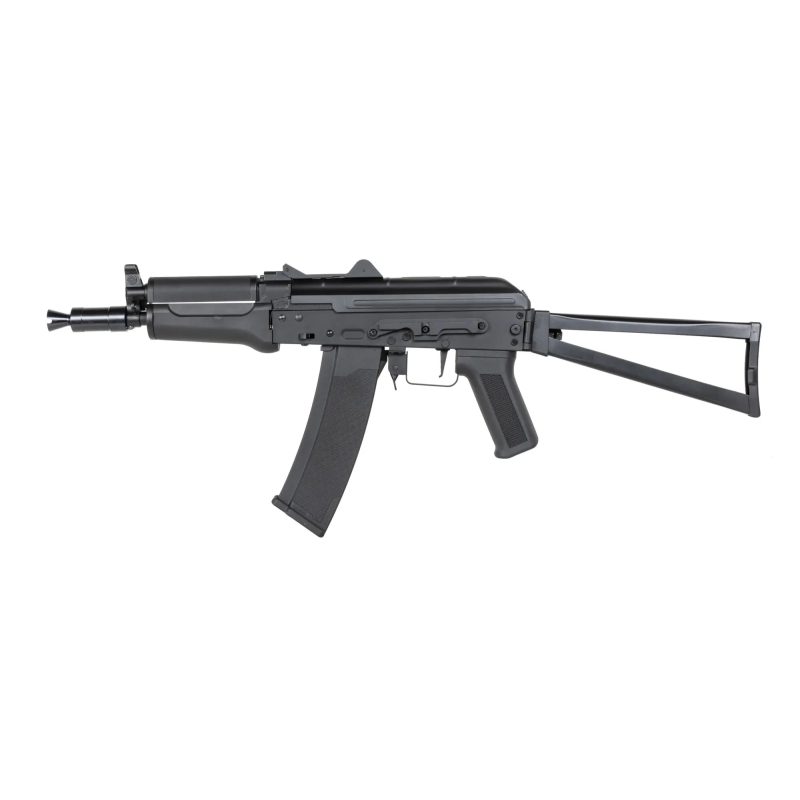 The Specna Arms AKS-74UN (SA-J81 CORE™ HAL ETU Gen.2) replica stands out with its high-quality external nylon body, which features a matte finish and highly realistic appearance. Reinforced with glass fibers, the body is very durable and lightweight. Key parts such as the outer barrel, gas block, sights, and barrel mounts are made of metal, while various small parts and screws are even made of steel. The rifle has a polymer handguard and metal folding stock. The battery is placed under the dust cover, and stick-type batteries are recommended.