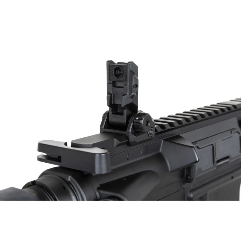 Inside, you will find a reinforced V2 Hybrid gearbox with a quick spring change (QSC), allowing you to adjust power output to match any airsoft event you plan to attend. The gearbox features steel gears in an 18:1 ratio and a 24K high-torque 21TPA neodymium motor for high-performance output.