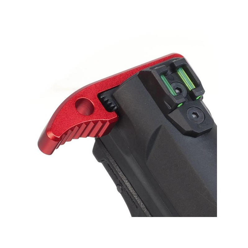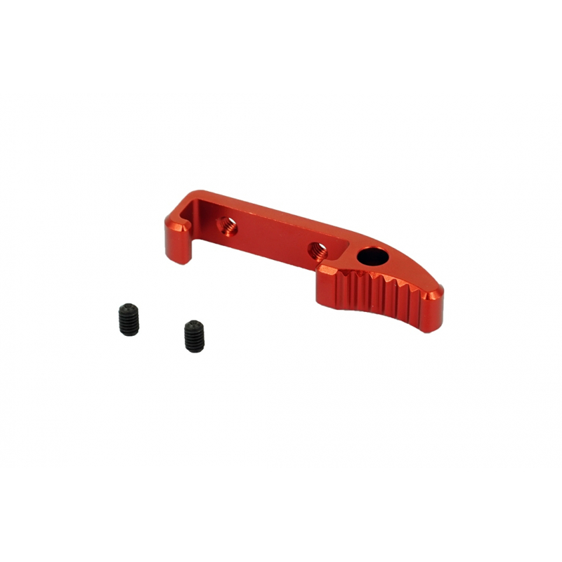 CNC Enlarged Magazine Catch for AAP-01 / AAP-01C by Action Army in red. Improved magazine handling thanks to durable aluminum construction. Upgrade part for faster reloading. Only for AAP-01 GBB pistols. Ideal for use with heavy 50rds long magazines. Compatible with both the original grip and CTM-TAC FUKU-2.
