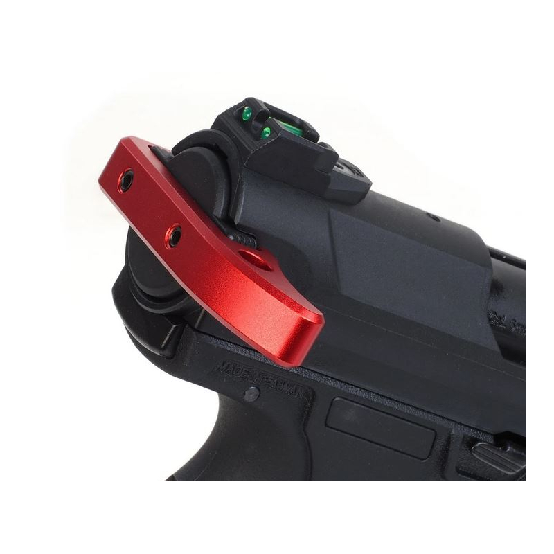 CNC Aluminum Thumb Stopper for AAP-01 by Action Army in red. Allows firm thumb bracing while shooting. Improves grip stability and weapon control. Ambidextrous design for both right- and left-handed users. Durable CNC aluminum construction.