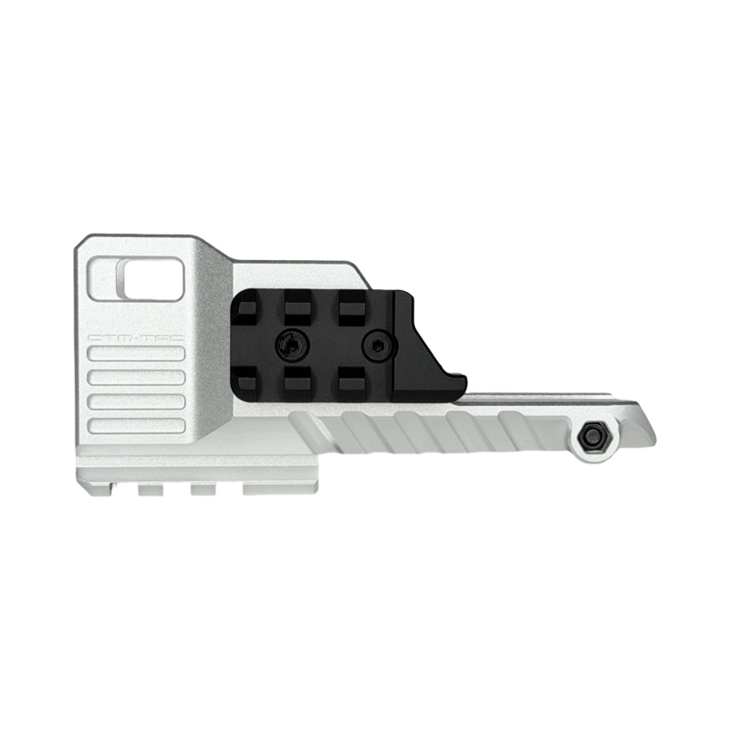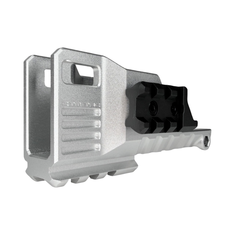 CTM TAC extended Rail Blast Shield M4XIMUS Compensator in silver finish is a robust upgrade for the AAP-01 airsoft pistol equipped with the HPA M4XIMUS kit. It offers a solid CNC aluminum construction, expanded accessory mounting options and significantly improved platform stability. Ideal upgrade for SpeedSoft and aggressive CQB gameplay.