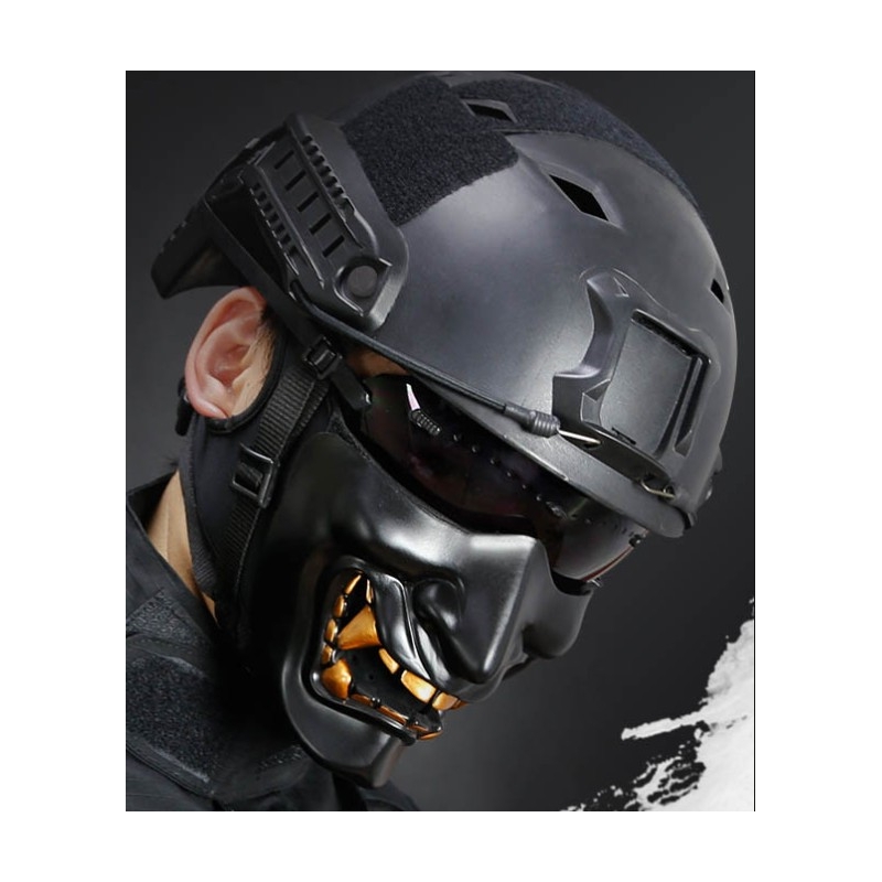 PRAJNA mask by WoSporT is a protective mask designed for the lower part of the face. It protects teeth, nose and cheeks from BB impacts and at the same time creates a strong visual effect inspired by Japanese masks. The name Prajna, also known in Japanese as Hannya, refers to a traditional theatrical mask representing the demonic form of a jealous woman. The modern airsoft interpretation also draws inspiration from historical samurai face armor Menpō, whose aggressive expression was meant to intimidate opponents. The elastically adjustable strap allows universal use and the mask is designed to remain breathable even during dynamic movement. The mask naturally requires quality certified eye protection. The mask leaves the ears free, so it does not limit the use of tactical headsets.
