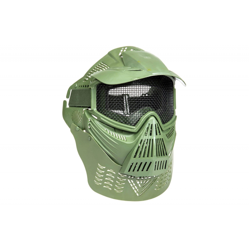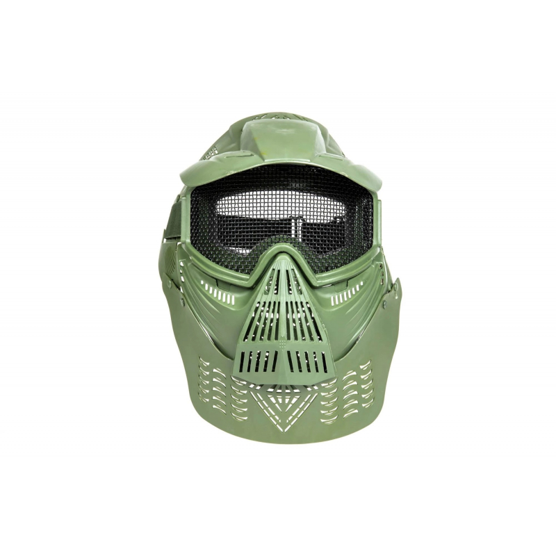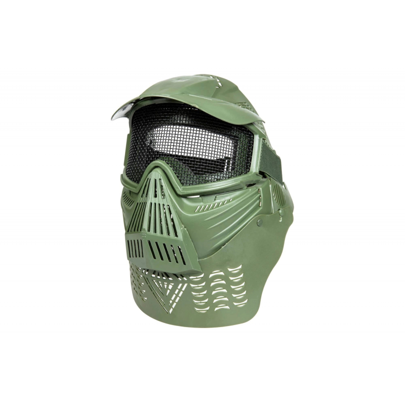 The mask is made out of plastic. The mask consists of goggles made out of a metal mesh, a part that covers the face and neck, and a part that covers the forehead. The inner part of the goggles has a soft lining that reduces abrasions and injuries to the face. The elastic fastening strap is adjustable in length. The part covering the mouth, neck and forehead has ventilation holes. The mask is modular - it’s possible to detach some elements, it is also possible to detach the goggles completely.