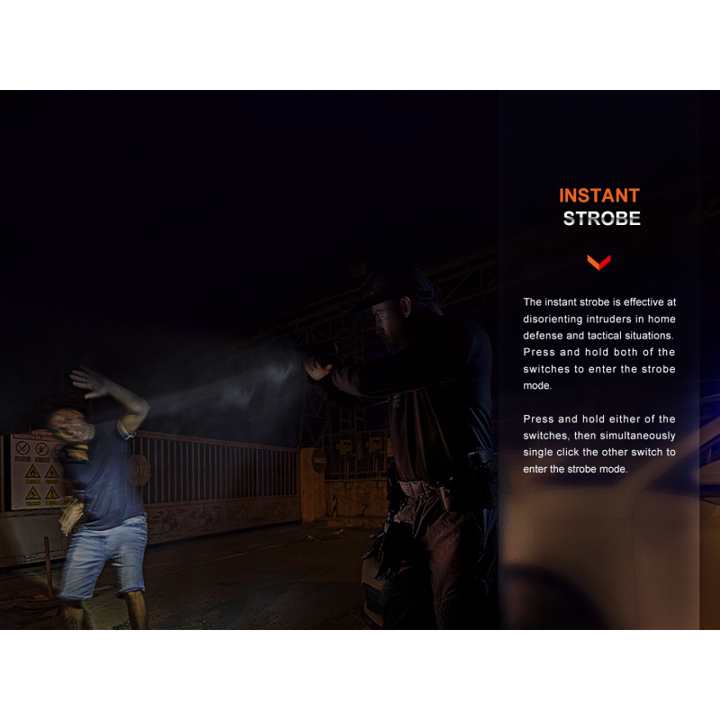 Press both switches simultaneously to activate the strobe. The strobe can also be activated by pressing and holding one of the switches and clicking the other switch. Press one switch again to exit the instant strobe mode or press both switches simultaneously to return to the last output used.