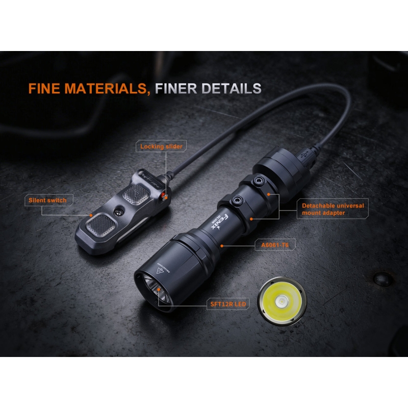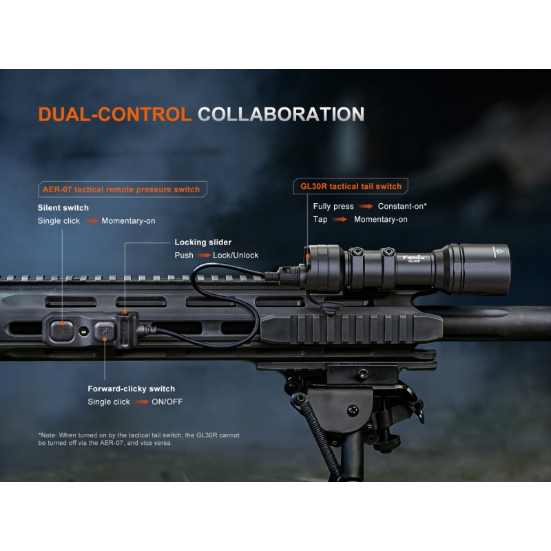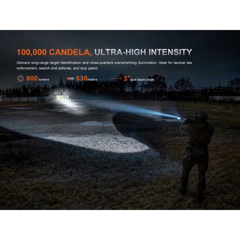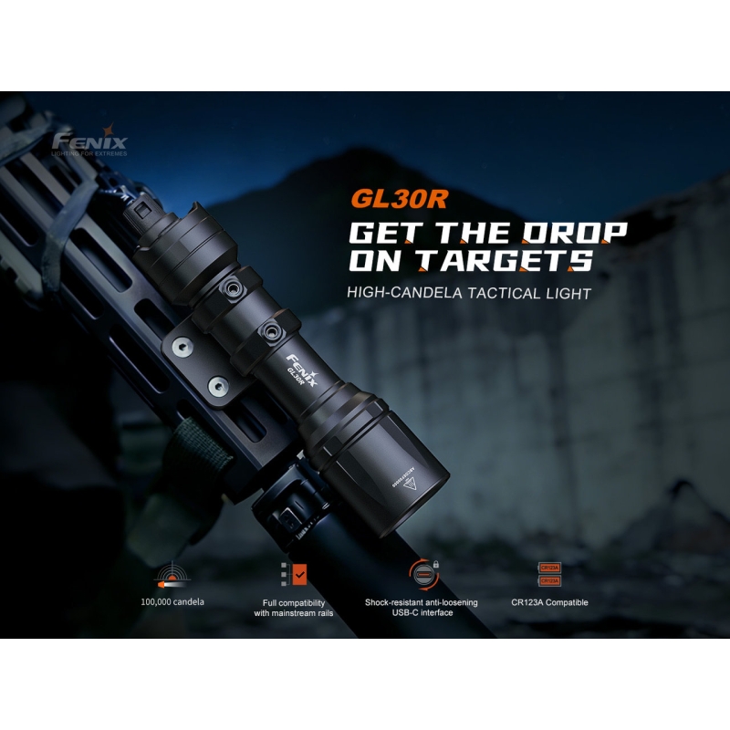 FENIX tactical flashlight GL30R with remote switch in black is a high-performance weapon light with a beam distance up to 630 m and output of 800 lumens. It offers USB-C charging, remote control with mounting on RIS rail and M-LOK. Designed for law enforcement or military use, as well as tactical shooting and airsoft. Powered by a Li-Ion 18650 battery (3400 mAh) or 2× CR123A batteries.