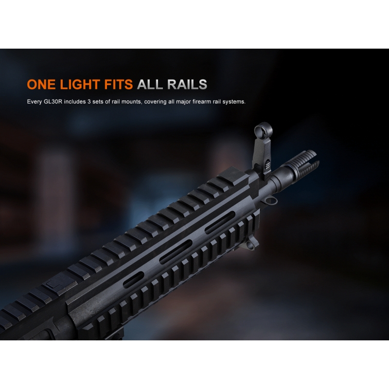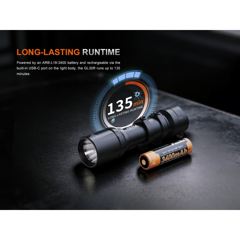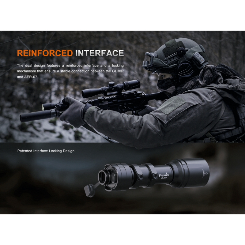 Fenix GL30R is designed for mounting on long guns and delivers a combination of high output, durability, and intuitive operation. The 800 ANSI lumens output with a focused beam reaches up to 630 meters. The flashlight uses a Li-ion 18650 rechargeable battery (3400 mAh) with USB-C charging, or alternatively 2× CR123A batteries. Operation is handled via the rear switch or the AER-07 remote switch with a lock to prevent accidental activation. With included mounts, it can be easily attached to a RIS rail or M-LOK slot in both inline and offset positions. The durable aluminum body withstands demanding conditions in the field or at the range.