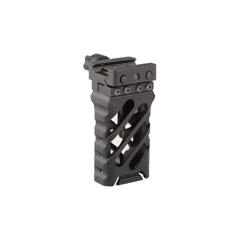5KU ULTRALIGHT 45 Vertical Grip is a compact front grip for weapons equipped with a standard RIS mounting rail. The grip body is made of CNC-machined aluminum, ensuring precise manufacturing and high resistance to mechanical stress. The skeleton design reduces weight while maintaining strength. The QD mounting allows quick installation and removal without tools, which is useful when changing your weapon configuration or for transport. The grip features a very strong rail clamp, therefore we recommend using it mainly on metal RIS rails and handguards where there is no risk of damaging the rail by excessive tightening. Also, do not overtighten the screws to avoid damaging the threads.