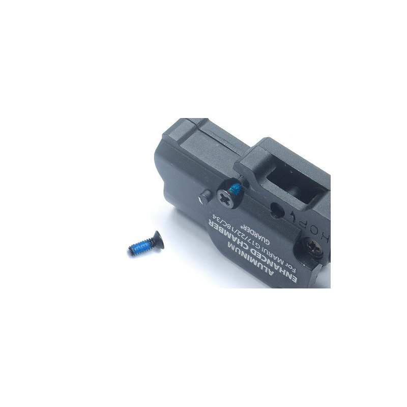 The Guarder Enhanced Hop-Up Chamber Set is an upgraded version of the hop-up chamber for gas airsoft pistols Tokyo Marui G-Series (models 17, 18C, 22, 34). The aluminum construction makes it significantly more durable than the original version made of metal alloy. The set includes a reinforced pressure lever that ensures a better hop-up effect and allows effective use of heavier BBs. The chamber is also equipped with locking screws to prevent loosening during shooting and an adjustment wheel for fine-tuning pressure. Thanks to improved pressure regulation, this hop-up chamber is an excellent upgrade for players looking to achieve greater accuracy, range, and consistent performance from their pistol.