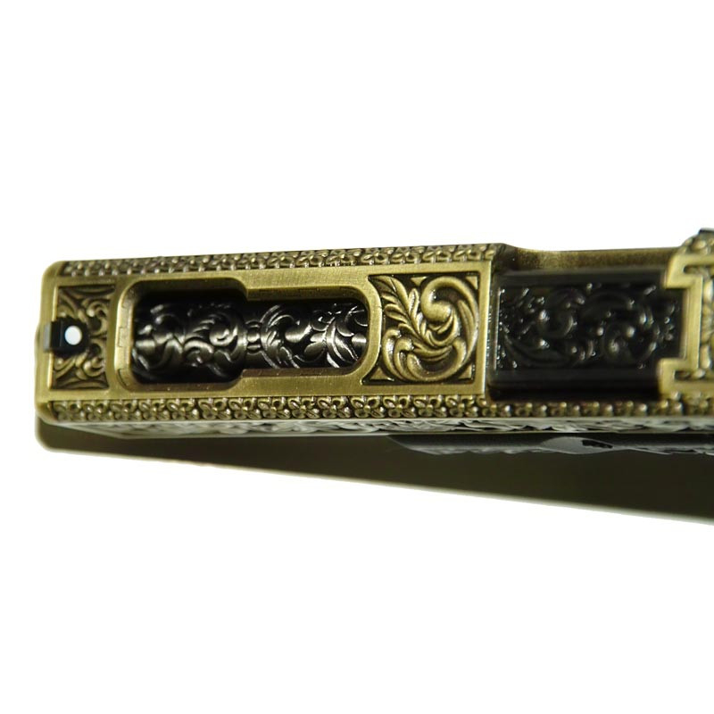 The WE GBB gas-powered Glock 18C Gen4 (G002BOX-FB) in a luxurious Antique Bronze finish and engraving all over the gun in the style of historic pirate pistols.