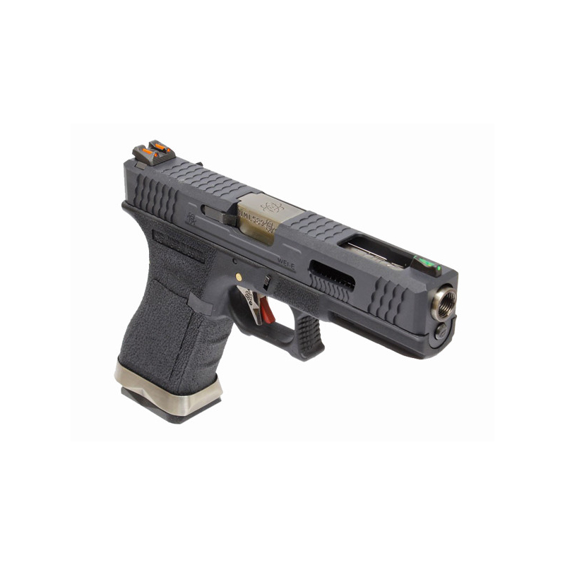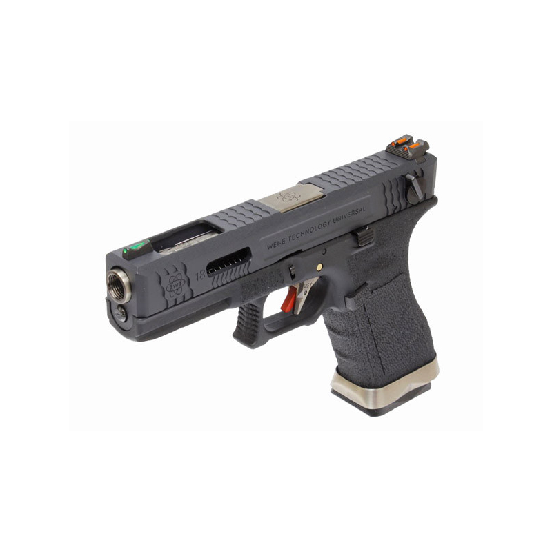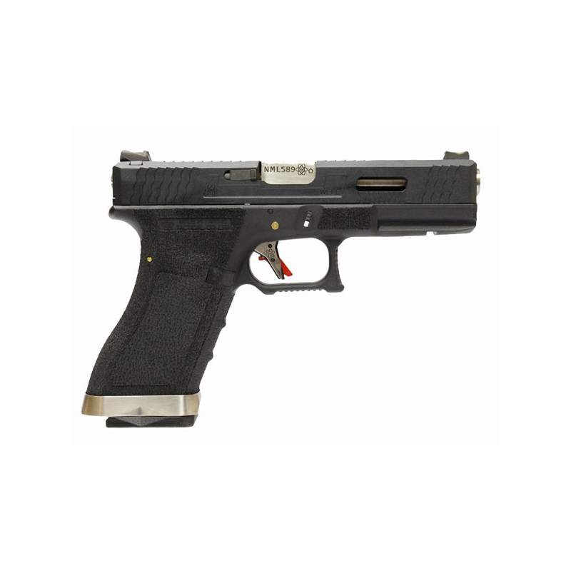 Due to the lack of an official license (unlike VFC/Umarex/GHK), WE cannot equip its replicas with official Glock markings and model names like G17, etc., hence WE pistols are labeled with the letter R. For example, model R17 Gen4 is the designation for the unofficial replica of the G17 Gen4 pistol.