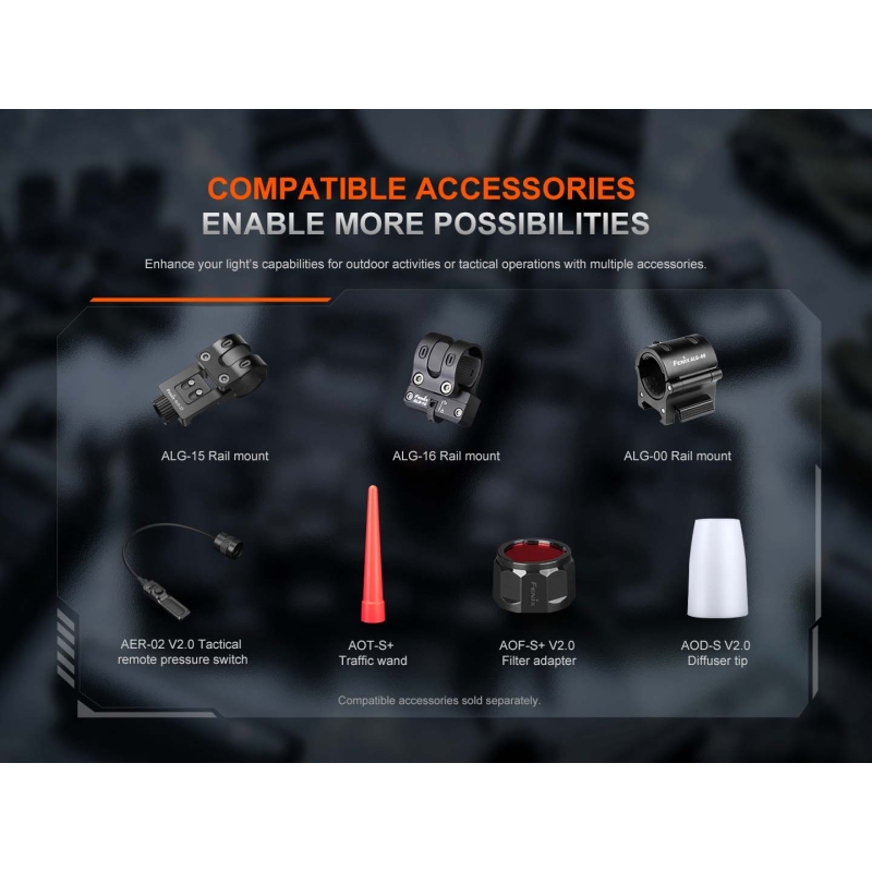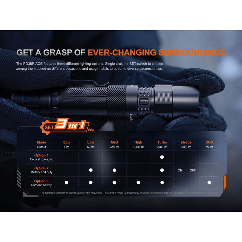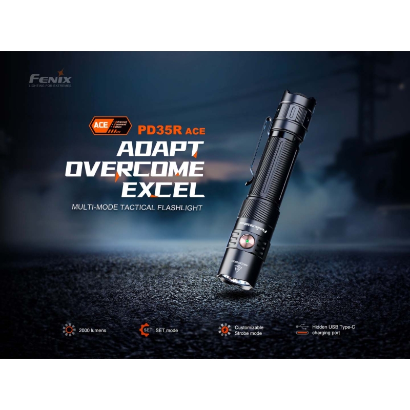 Looking for a powerful, compact, and fully programmable tactical flashlight? With various lighting modes and the option to power it with 1× 18650 battery or 2× CR123A batteries? A flashlight that runs for up to 700 hours on the lowest brightness and delivers 2000 lumens at maximum? Then the FENIX PD35R ACE is the one for you, offering top-tier light output of up to 2000 lumens, 380-meter beam distance, and 7 lighting modes including strobe and SOS. Thanks to the unique SET button, you can choose from 3 profiles – tactical, duty, or universal outdoor mode. Power is provided by a Li-ion 18650 battery with a capacity of 4000 mAh, rechargeable directly in the flashlight via USB-C. Alternatively, 2× CR123A (rechargeable RCR123A or high-performance 16340) batteries can be used. The PD35R ACE is IP68-rated, features a hardened aerospace aluminum body, digital output regulation, and a battery status indicator.