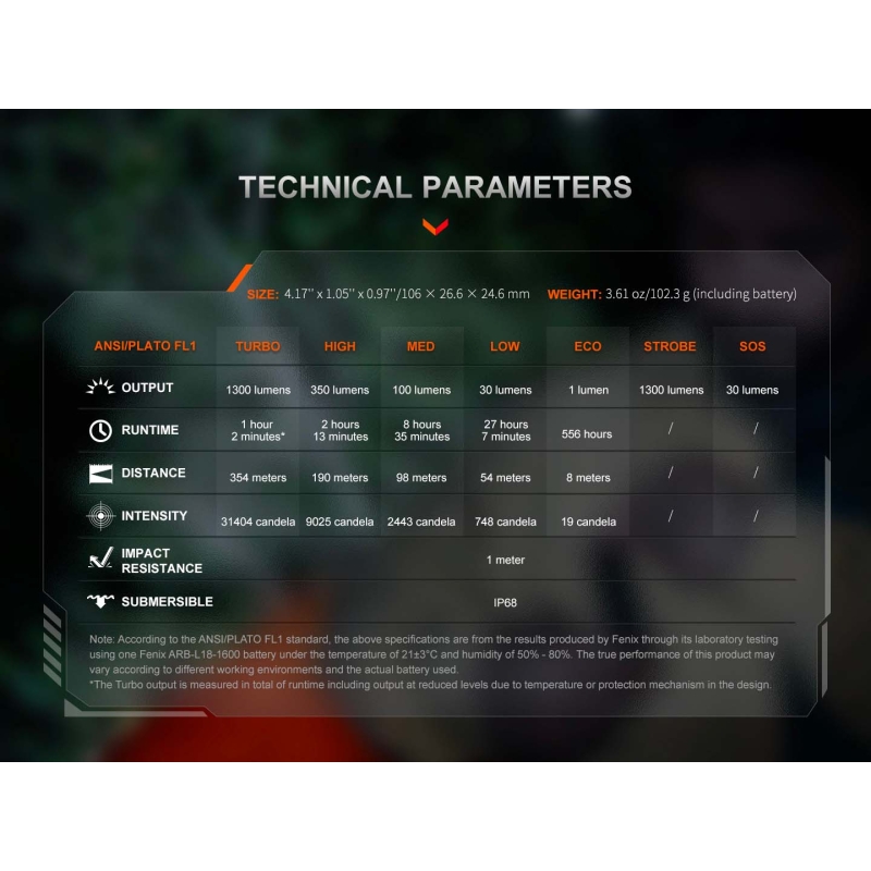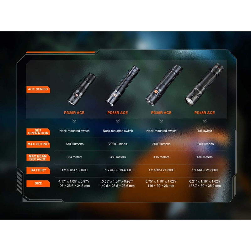 Looking for a powerful yet compact flashlight that works for both duty use and everyday carry? Do you want 1300 lumens of brightness with a throw over 350 meters, while weighing just a little over 100 grams? Need a programmable flashlight with selectable output modes for any situation? Then the FENIX PD26R ACE is the perfect choice. Equipped with a premium LED emitter Luminus SFT-25R, digital regulation and intelligent overheat protection, it delivers stable performance and reliability. Its 7 lighting modes including strobe and SOS ensure versatility. The anti-roll, anti-slip body design makes it safe to handle, while IP68 waterproofing and 1 m impact resistance make it ready for professionals and demanding users alike.