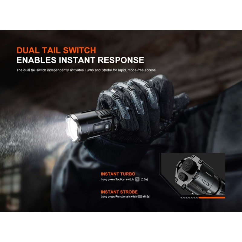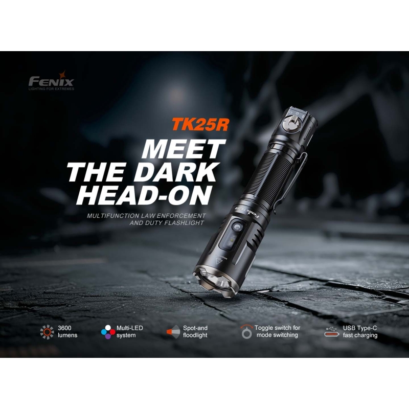 Are you looking for a high-performance tactical flashlight capable of handling duty work, emergency situations, and search operations? Do you need a strong beam, instant TURBO access and also a practical side light for close-range tasks? Do you want a durable design with simple controls you can trust? Then the Fenix TK25R is exactly what you need. The main reflector with a premium Cree XHP50.3 LED delivers up to 3600 lumens and a precisely focused beam with a 350 m reach. The unique side light adds diffused white light, red light for night-vision preservation and UV 365 nm light suitable for ID verification, banknote checks or technical inspection. Naturally, it also includes a red-blue police flash. Its robust body made of aircraft-grade aluminum, IP68 waterproofing and a tactical dual switch make it an ideal tool for police, rescue units, security personnel and demanding airsoft use.
