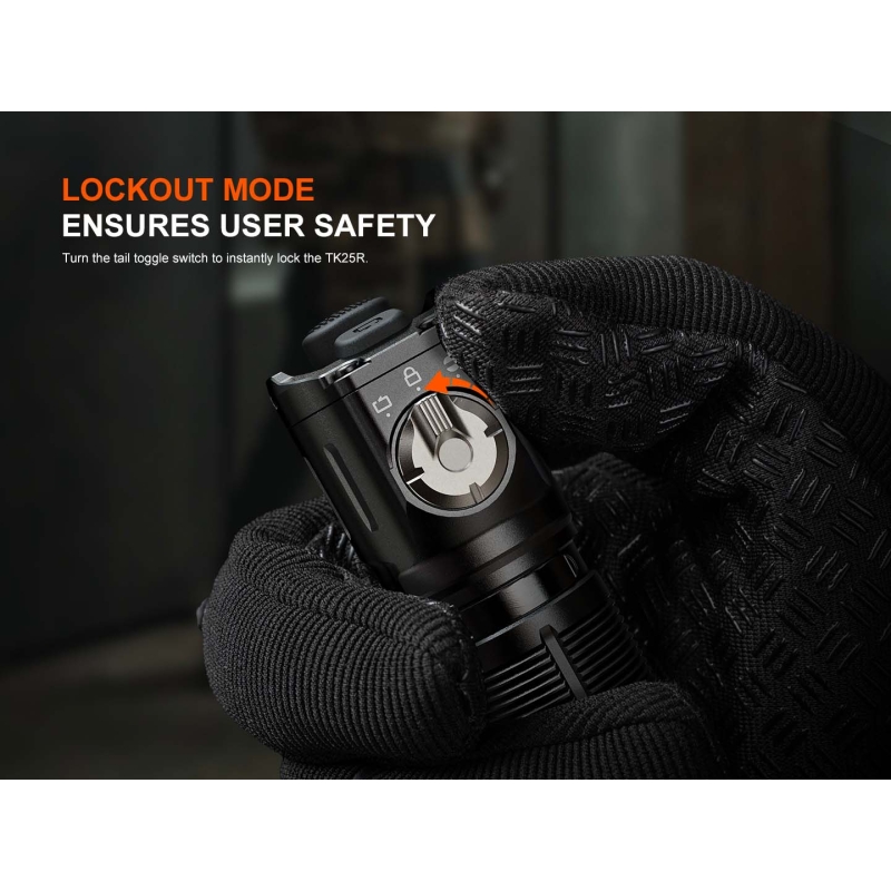 Rechargeable tactical LED flashlight TK25R by Fenix in black.