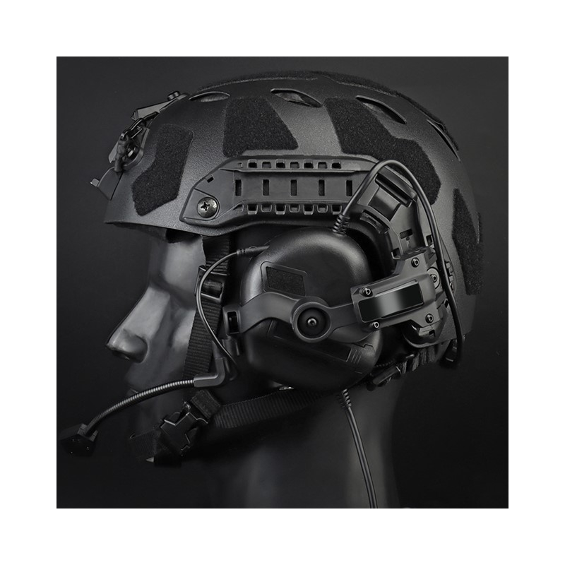 Helmet Mount Adapter for Headset by FMA in black. Designed for Peltor Comtac headsets and their replicas (FMA, Tac-Sky, and others). ARC mount type (for FAST, MICH, and AIRFRAME helmets). Allows for wearing a tactical headset directly on the helmet. Rotating base for precise adjustment of the ear cups. Compatible with helmet cutouts.