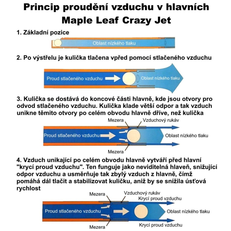 The special Crazy Jet technology by Maple Leaf ensures better accuracy and precision through a unique barrel tip design. The end of the barrel features a double wall that directs gas flow around the BB after it exits the inner barrel. This airflow stabilizes the BB, reducing drag and improving flight stability, allowing the BB to fly further and more accurately.