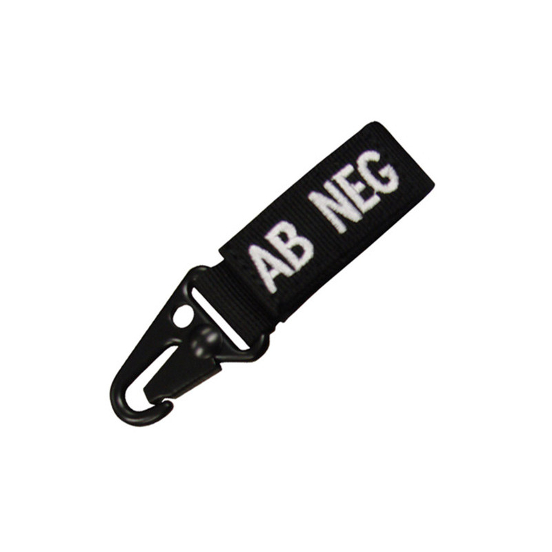 key chain bearing the blood group and Rh factor wearer Format: olive drab , black font Can be worn on a belt, PALS, keys and a number of other things by affixing 'Crocodile ' buckles or dressed prievleku width 5 cm Material: nylon, metal buckle