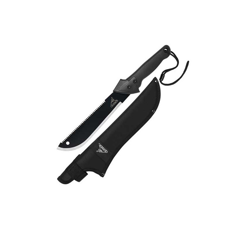 View larger Built just as tough but shorter and more packable, this version keeps the same dual blade. Perfect for back-country travel, the fine edge tackles brush and vines while the saw cuts limbs and small trees. The Gator Grip keeps tasks comfortable and securely in hand.