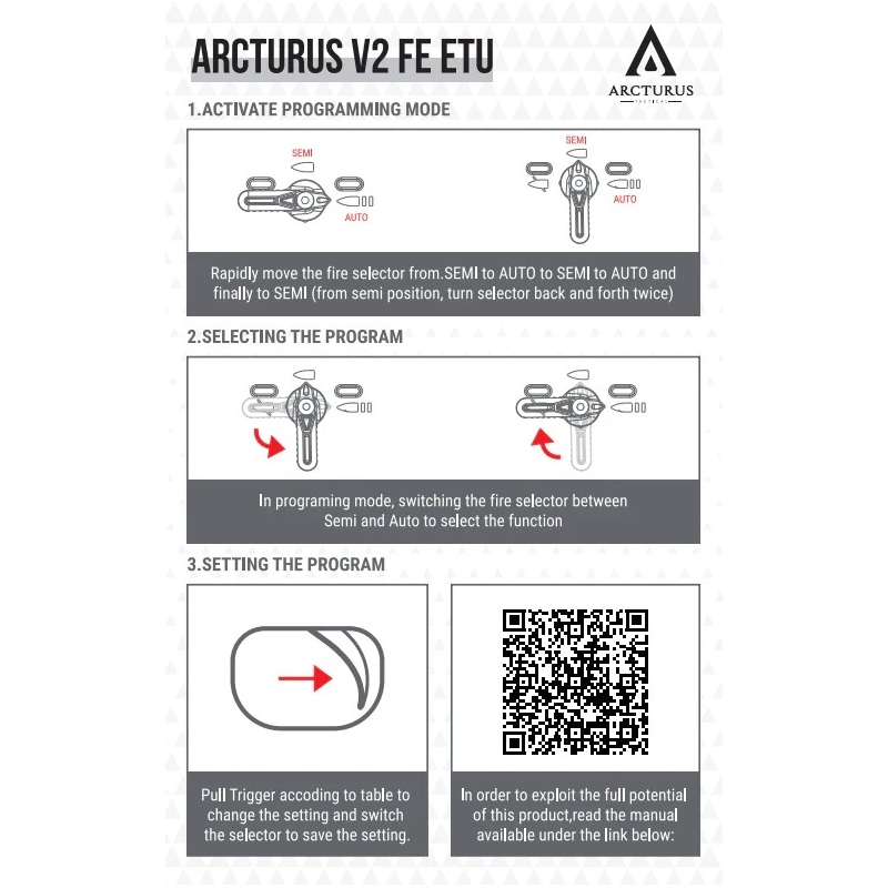 Arcturus guns are not just perfect on the outside—the inside is equally top-notch. The rifle is equipped with an ARC FE electronic unit (FE Optical ETU MOSFET System), which allows fire mode customization (Semi, 3rd Burst, Binary, Full Auto), 7 levels of pre-cocking (pre-cocking) for an ultra-fast trigger response, and active braking (8 levels of braking), which prevents unwanted piston movement after firing. The electronics also include overvoltage protection and a low battery warning. As a bonus, it offers 5 levels of trigger sensitivity adjustment and 5 trigger reset positions.