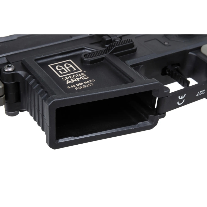 The Specna Arms M4 Carbine RL M-LOK Gen2 (SA-F05-RL FLEX™ BLDC™ HAL ETU™) stands out with a high-quality nylon receiver featuring a matte finish and a very realistic look. Thanks to glass-fiber reinforcement it’s very durable and lightweight. The outer barrel is metal, and the screws, ejection cover and pins are steel. The ergonomic AR15 design and modern RL construction provide a comfortable grip and easy handling—this rifle just fits your hand! The M-LOK handguard lets you mount accessories like a grip, AN/PEQ box, flashlight, etc. With the adjustable Light Ops stock there’s room for Buffer stick battery. Overall, it’s a rifle that combines low weight and premium internals with an attractive price.