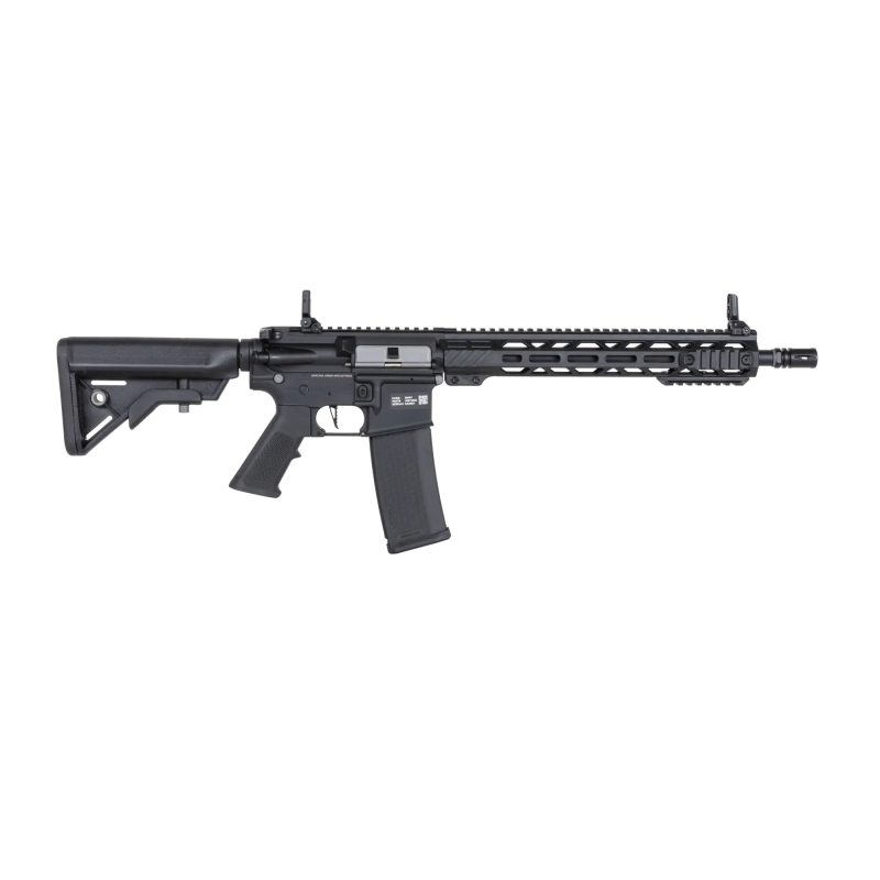 The Specna Arms M4 Carbine M-LOK Gen2 (SA-F09 FLEX™ BLDC™ HAL ETU™) stands out with a high-quality nylon receiver featuring a matte finish and a very realistic look. Thanks to glass-fiber reinforcement it’s very durable and lightweight. The outer barrel is metal, and the screws, ejection cover and pins are steel. The ergonomic AR15 design and modern construction provide a comfortable grip and easy handling—this rifle just fits your hand! The M-LOK handguard lets you mount accessories like a grip, AN/PEQ box, flashlight, etc. With the adjustable Crane type stock there’s room for larger batteries (Buffer Stick, Nunchuck or Crane). Overall, it’s a rifle that combines low weight and premium internals with an attractive price.