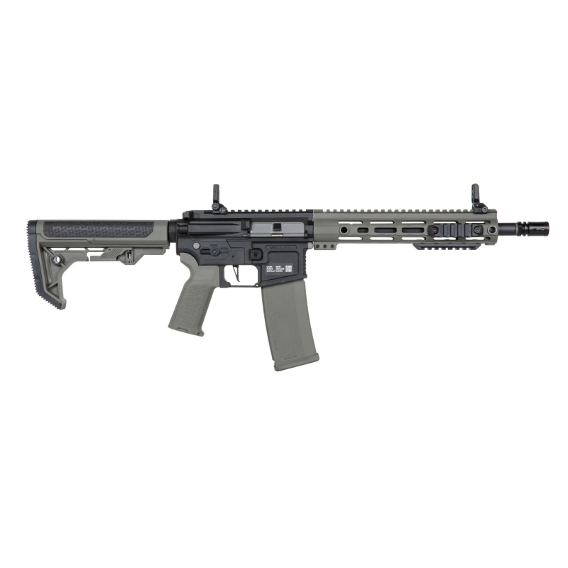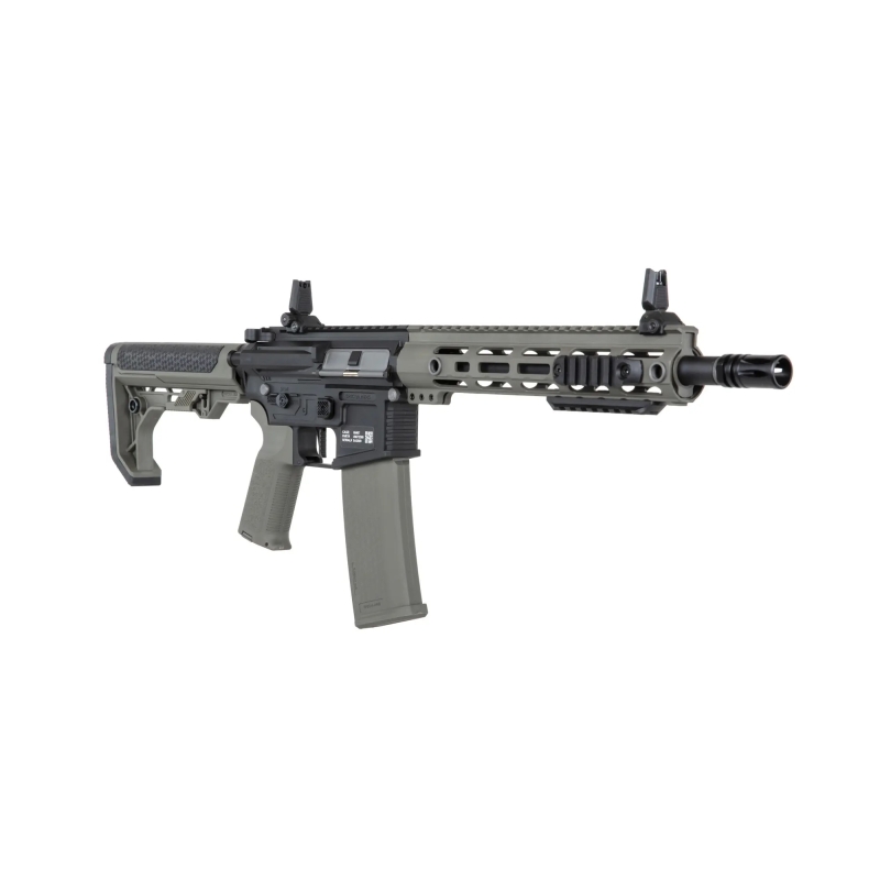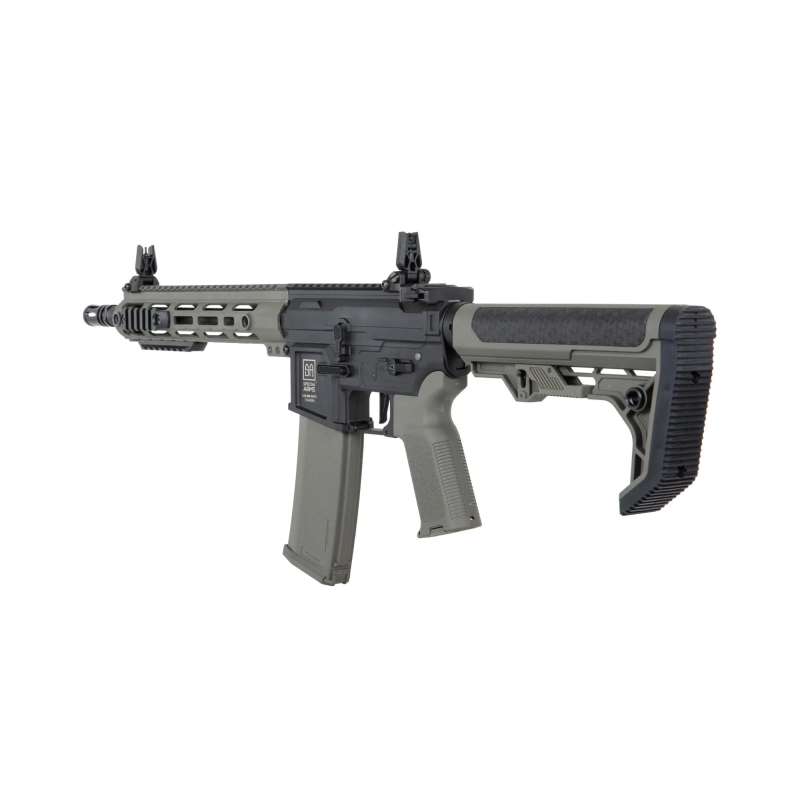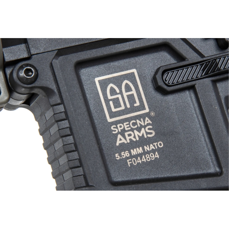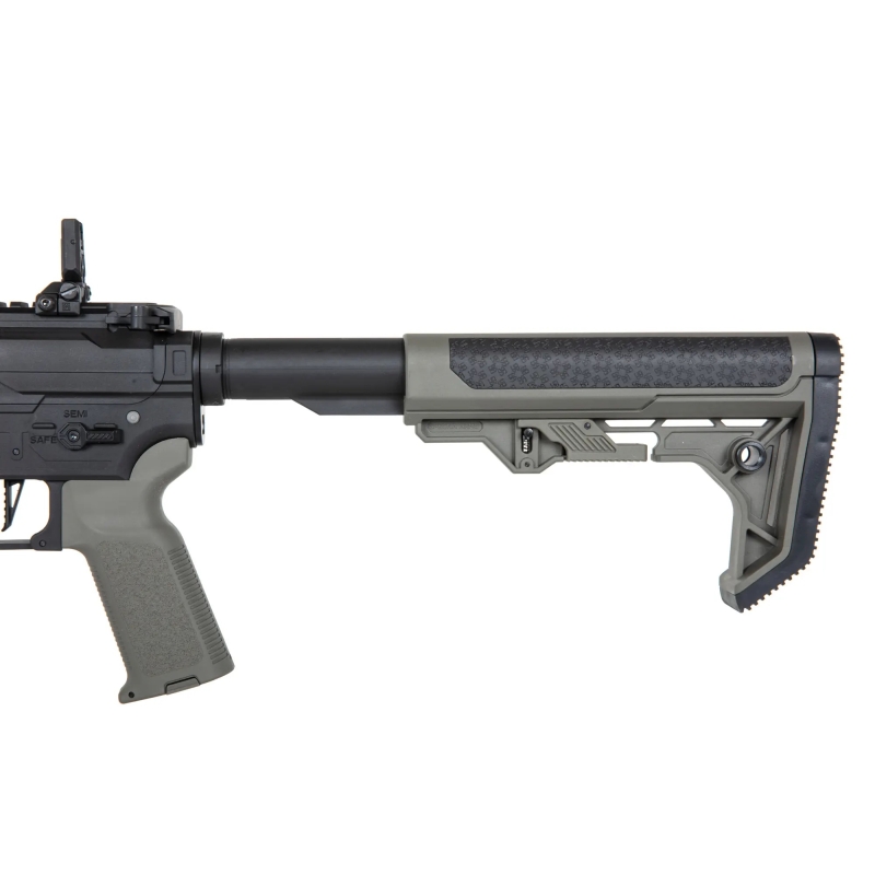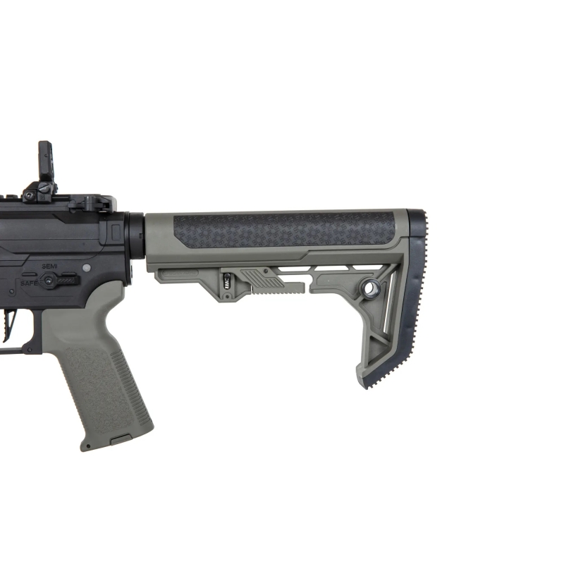 Specna Arms M4 Carbine RL M-LOK Gen2 (SA-F05-RL FLEX™ HAL ETU™) is built on a lightweight yet durable FLEX™ series RL AR15 nylon body reinforced with glass fiber, offering a realistic matte finish and high durability, outperforming cheaper alloy receivers. This model belongs to the RL SAAS (Specna Arms Accessory System) line, featuring a more aggressive design that visually stands out from standard AR15 receivers. The outer barrel with a 14 mm CCW thread and steel components such as pins, screws, and the ejection port add strength where needed. The result is a lightweight yet durable assault rifle that handles excellently and is perfect for CQB gameplay and dynamic movement. The AR15 (M4) platform ensures intuitive controls, including an ambidextrous charging handle, fire selector, and easy hop-up adjustment via the ejection port. The M-LOK handguard allows mounting accessories such as a foregrip, tactical flashlight, or PEQ box. The Light Ops stock with rubberized cheek rest and QD sling points keeps the setup lightweight and stable. The battery is housed in the buffer tube, requiring a buffer stick battery. Overall, this rifle combines low weight, modern construction, and high-quality Gen2 internals in one accessible platform. The FLEX™ Gen2 series stands out with components such as the Æther™ gearbox, HAL ETU™, metal nozzle, TDC hop-up chamber, Helium™ flat bucking, and a 6.03 mm precision inner barrel.