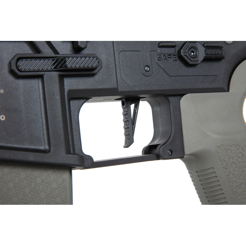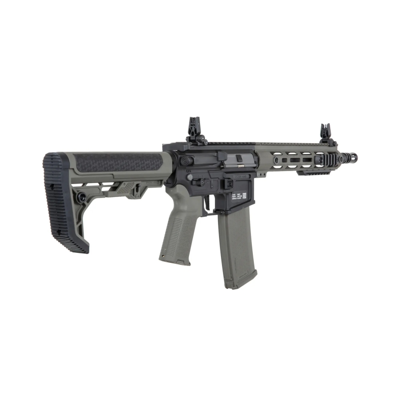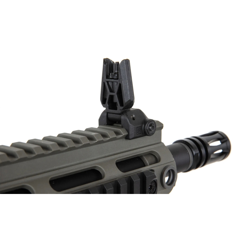 Specna Arms M4 Carbine RL M-LOK Gen2 (SA-F05-RL FLEX™ HAL ETU™) in olive green finish is a high-performance airsoft rifle with 115 m/s power and upgraded internals. It features a HAL ETU™ processor unit with pre-cocking and trigger sensitivity adjustment, along with a nylon RL AR15 body and M-LOK handguard. The TDC hop-up chamber with Helium™ flat bucking ensures excellent accuracy.