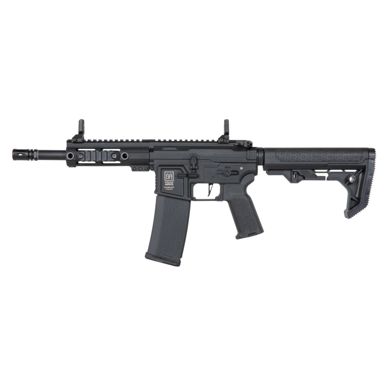 Specna Arms M4 CQB RL M-LOK Gen2 (SA-F04-RL FLEX™ HAL ETU™) is built on a lightweight yet durable FLEX™ RL AR15 nylon body reinforced with glass fiber, offering a realistic matte finish and excellent resistance to wear, outperforming cheaper alloy bodies. This is the RL SAAS model (Specna Arms Accessory System), featuring a more aggressive design compared to standard AR15 receivers. The outer barrel with a 14 mm CCW thread and steel components such as pins, screws, and the ejection port provide strength where it matters. The result is a lightweight yet robust assault rifle platform, ideal for CQB environments and dynamic gameplay. The AR15 (M4) platform ensures intuitive controls. It features an ambidextrous charging handle, clear fire selector, and easy hop-up adjustment through the ejection port. The M-LOK handguard allows mounting accessories such as a foregrip, tactical flashlight, or PEQ box. The Light Ops stock with rubberized cheek rest and QD sling points keeps the setup lightweight. The battery is stored in the buffer tube, requiring a buffer stick battery. Overall, this rifle combines low weight, modern construction, and high-quality Gen2 internals. The FLEX™ Gen2 series stands out with internals such as the Æther™ gearbox, HAL ETU™, metal nozzle, TDC hop-up chamber with Helium™ flat bucking, and a 6.03 mm precision inner barrel.