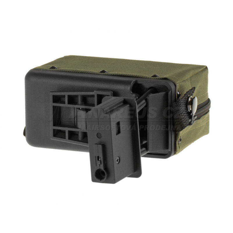Electric box magazine for T8 SP MK46 (M249) by A&K in green (Olive Drab). Compatible exclusively with T8 SP Systems MK46/M249 LMG series. 2000 BBs capacity. Dummy ammo belt included. Realistic reloading with a new BB feed system directly under the bolt cover. Powered by a 9V battery (not included).