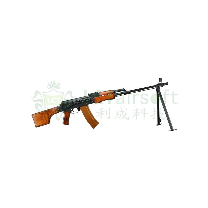The LCT RPK74 is a replica of the Russian RPK74M infantry machine gun. The gun has a beautiful steel body that is identical to the original model. The machine gun has a long outer barrel on which we can find folding legs and a front sight. There is a mounting rail on the side of the gun body for placing optics. The stock is foldable just like the military version, the stock is made of wood.