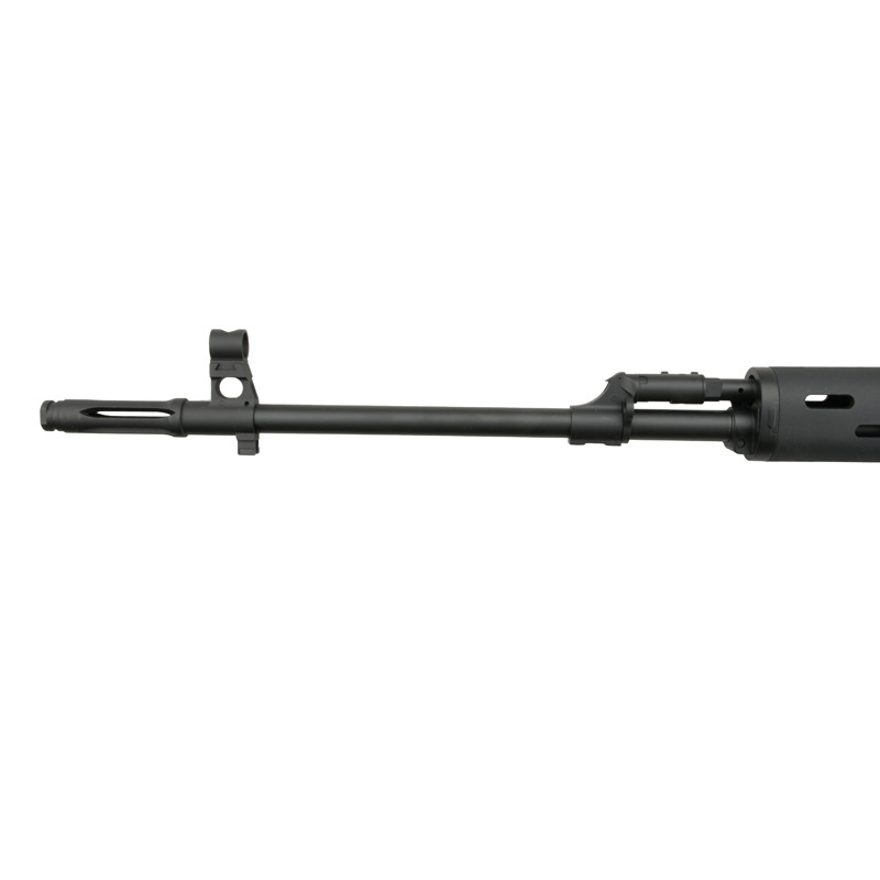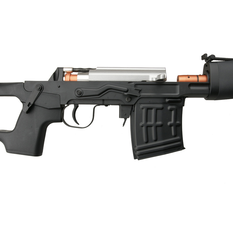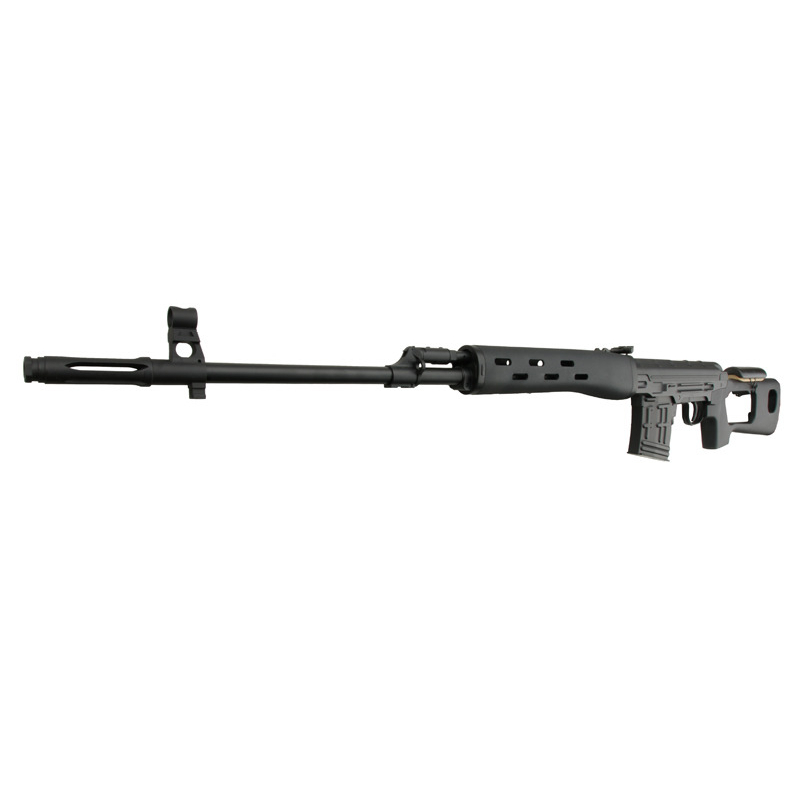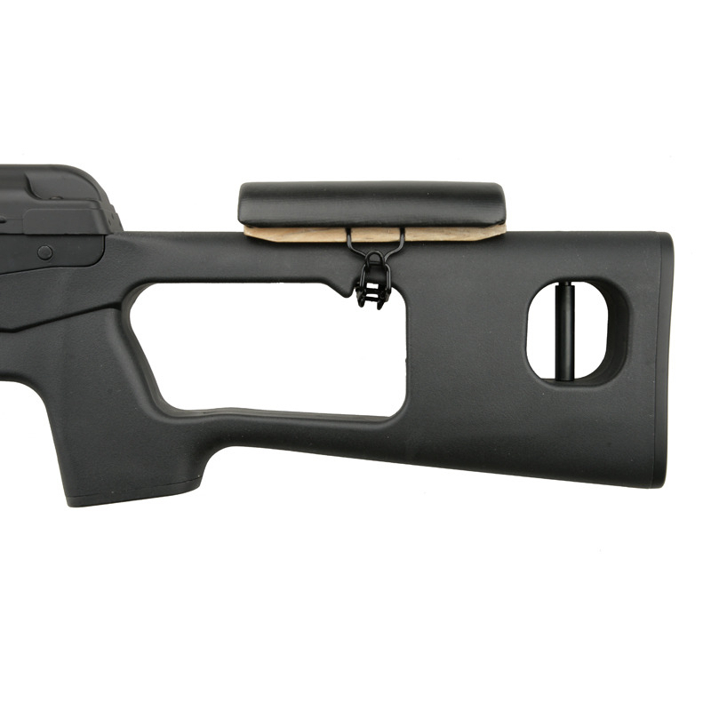 The spring action Russian sniper rifle replica made by the GFC Guns company is made of metal and high quality wood-like plastic material which visually replicates the classic version of the Russian technical thought. The replica’s body and the barrel assembly and the iron aiming sights are made of metal, while as the stock and the front grip are made of plastic. The stock is equipped with a cheek-pad, the so called “baka” which facilitates placing an accurate shot and it increases the comfort of use.