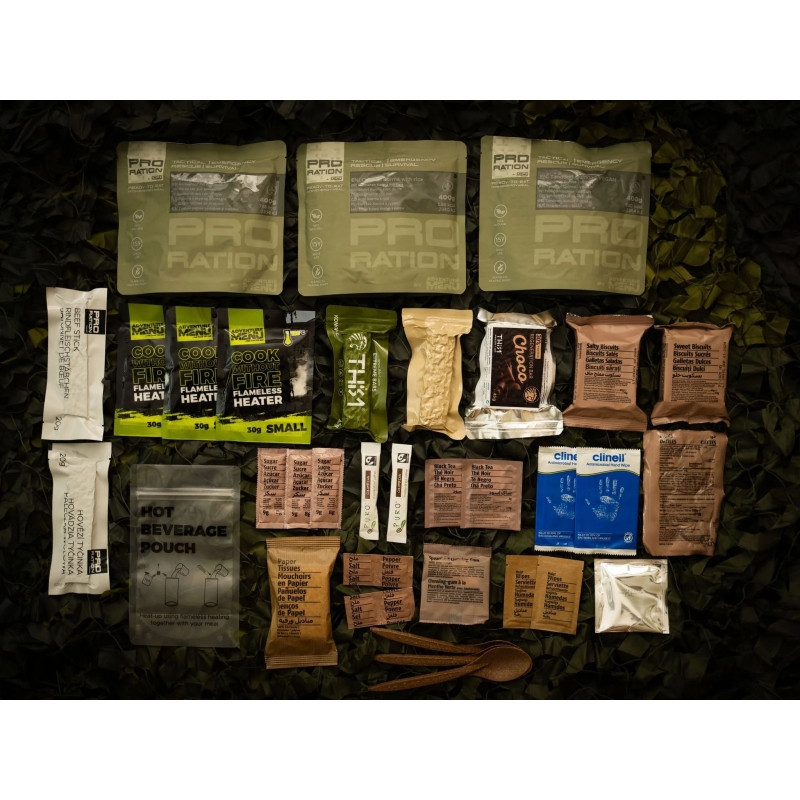 PRO-RATION | MRE Ultimate Tactical Ration FULL-DAY Menu 4 offers 3 main meals, see table below (3 × 400 g), plus several snacks, powdered drinks and everything needed for heating and consumption. The shelf life of the main meals is 15 years, yet they are 100% natural without chemical additives and hand-cooked by Adventure Menu. It meets NATO military standards for MRE food rations.