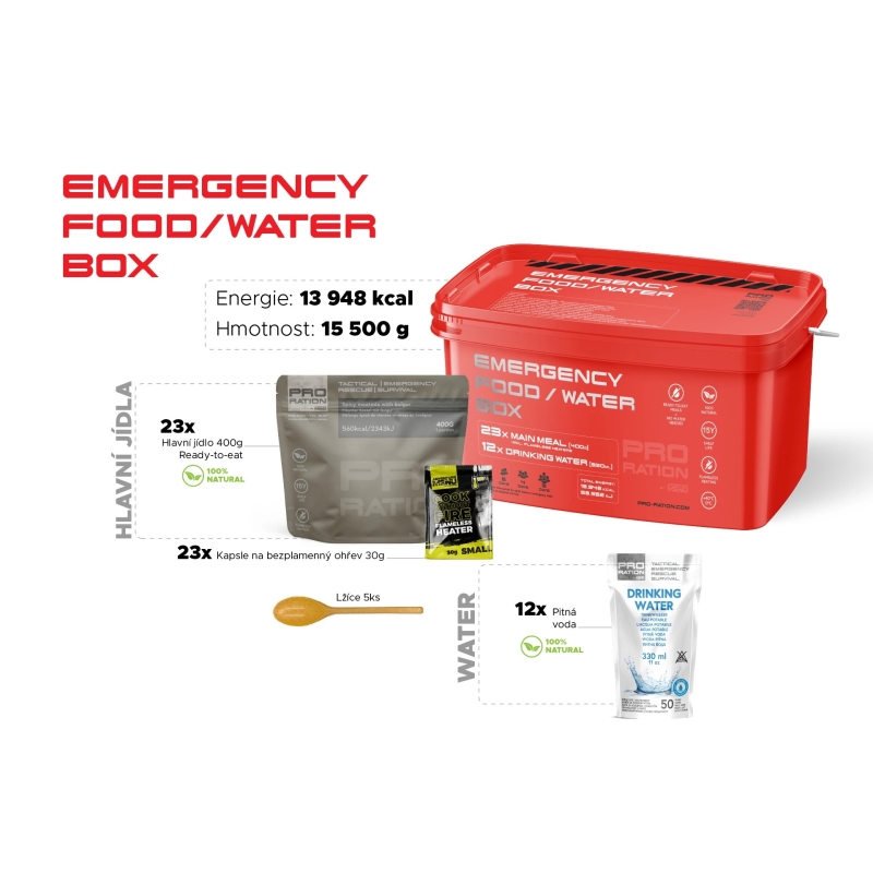 PRO-RATION EMERGENCY FOOD / WATER BOX is a complete emergency set for the whole family for 72 hours. It includes 23 MRE main meals (400 g) with a 15-year shelf life, 12 water packs (330 ml) with a 50-year shelf life and heating capsules. Meals from Adventure Menu are made from 100% natural ingredients without chemicals and are hand-cooked.
