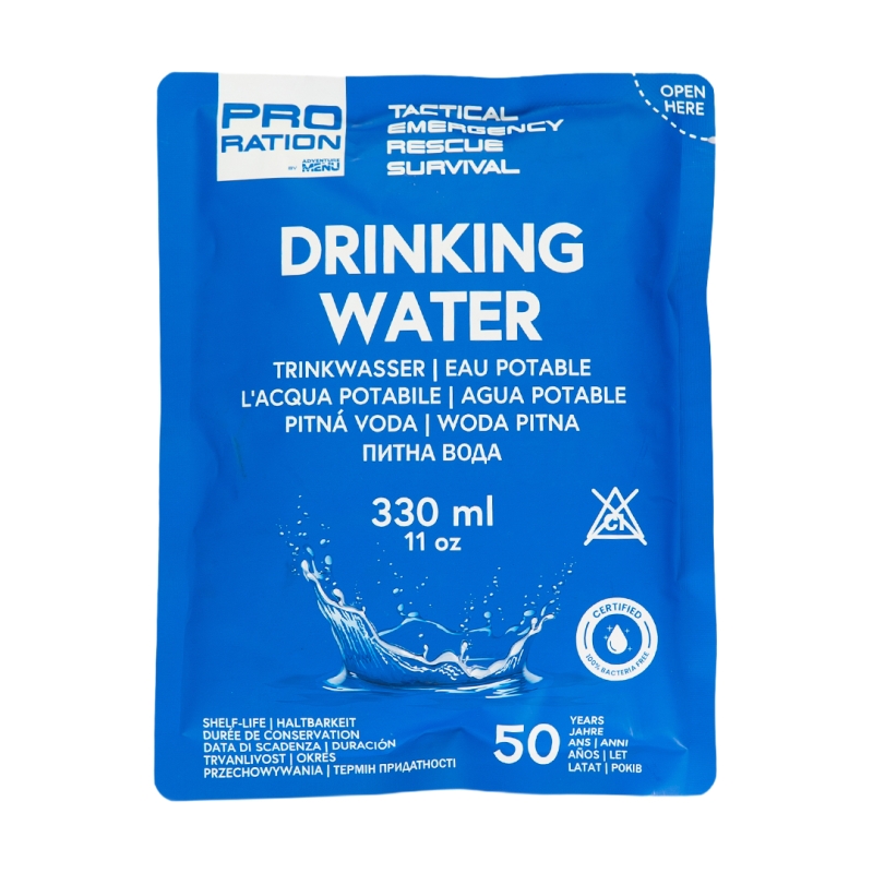 If you are looking for an emergency food package that will secure you and your family in critical situations, or simply want to keep enough food and water at home for several days without the need for cooking or electricity, then this emergency box is the right choice. The PRO-RATION Emergency Food / Water Box contains 23 main meals (400 g) from Adventure Menu, 12 water packs (330 ml) and 23 self-heating capsules in one compact plastic box. The meals have a shelf life of 15 years, water up to 50 years. Everything meets NATO specifications for military food rations M.R.E.. If you would like to expand this package with additional meals, we recommend choosing from our range of ready-to-eat meals from Adventure Menu. We offer not only classic meals, but also vegan and vegetarian options or smaller kids portions.