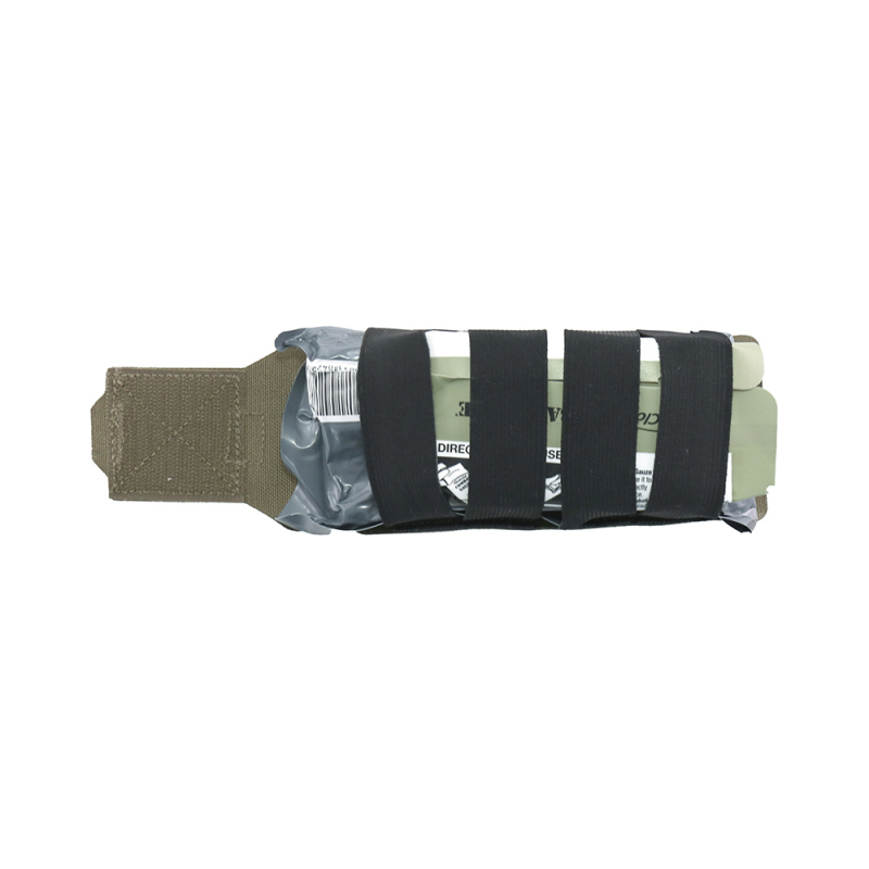 A modern horizontal IFAK pouch with laser-cut MOLLE interface designed for quick access to personal medical gear. The elastic internal insert is removable and held securely inside with Velcro and elastic side panels. Gear such as Combat Gauze, CAT tourniquet or trauma bandages are kept in place and instantly accessible with a single pull.