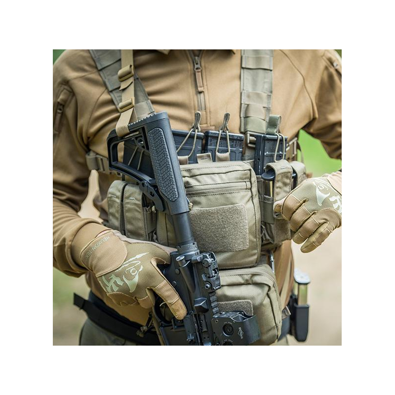 The CARBINE SLING is a two-point weapon sling designed to safely carry a long gun and relieve your hands during transportation. It is made of nylon mesh and features soft padding that effectively distributes the weight of the weapon and provides great comfort, even during long-term wear. The breathable padding prevents neck irritation. At the top of the sling, there is a practical pocket with a hook-and-loop flap, where you can store small accessories such as spare batteries or a flashlight.