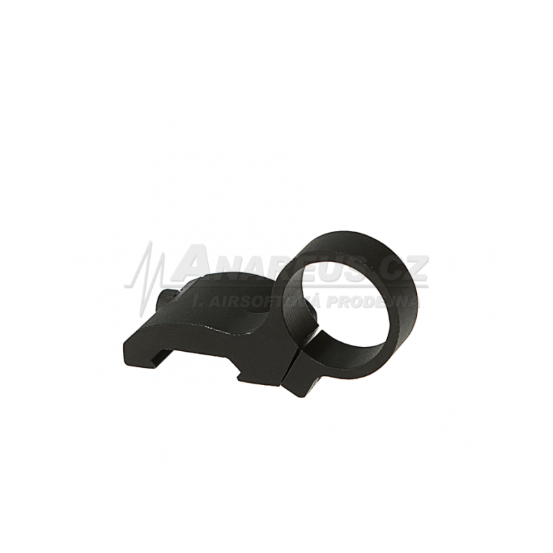 Offset RIS Mount Ring 25 / 30 mm by ASG in black. One-piece construction for 30 mm optics and red dot sights. Includes adapter for 25 mm tubes. Angled offset mount – ideal for aiming while wearing a mask. Compatible with 21 mm RIS rails.